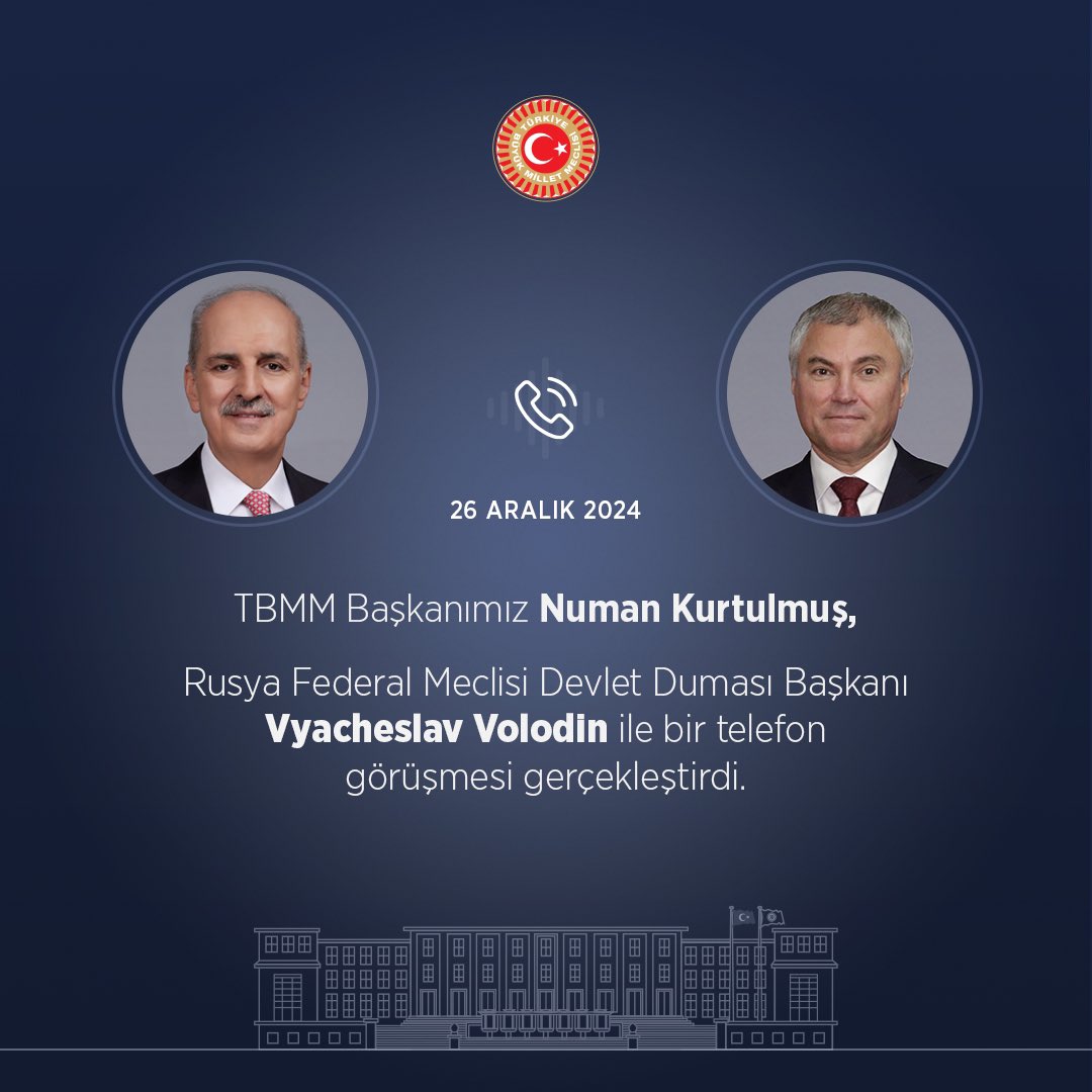 TBMM Başkanı Numan Kurtulmuş, Azerbaycan Hava Yollarına ait yolcu uçağının Kazakistan'ın Aktau kenti yakınlarında düşmesi nedeniyle Rusya Federal Meclisi Devlet Duması Başkanı Vyacheslav Volodin’i telefonla aradı.