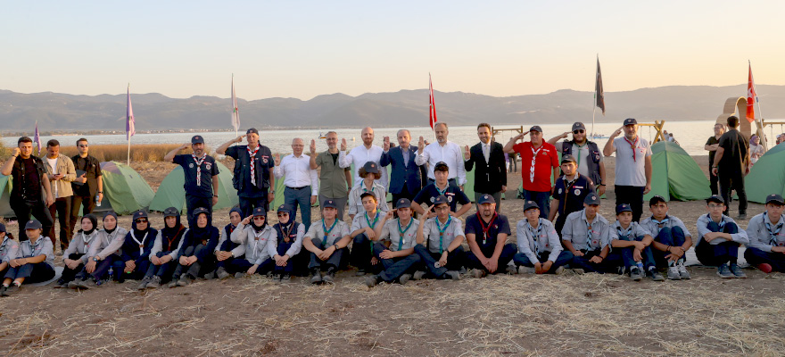 İznik Gölü'nün kıyısındaki izcilerle de bir araya gelen Şentop öğrencilerle hatıra fotoğrafı çektirdi.