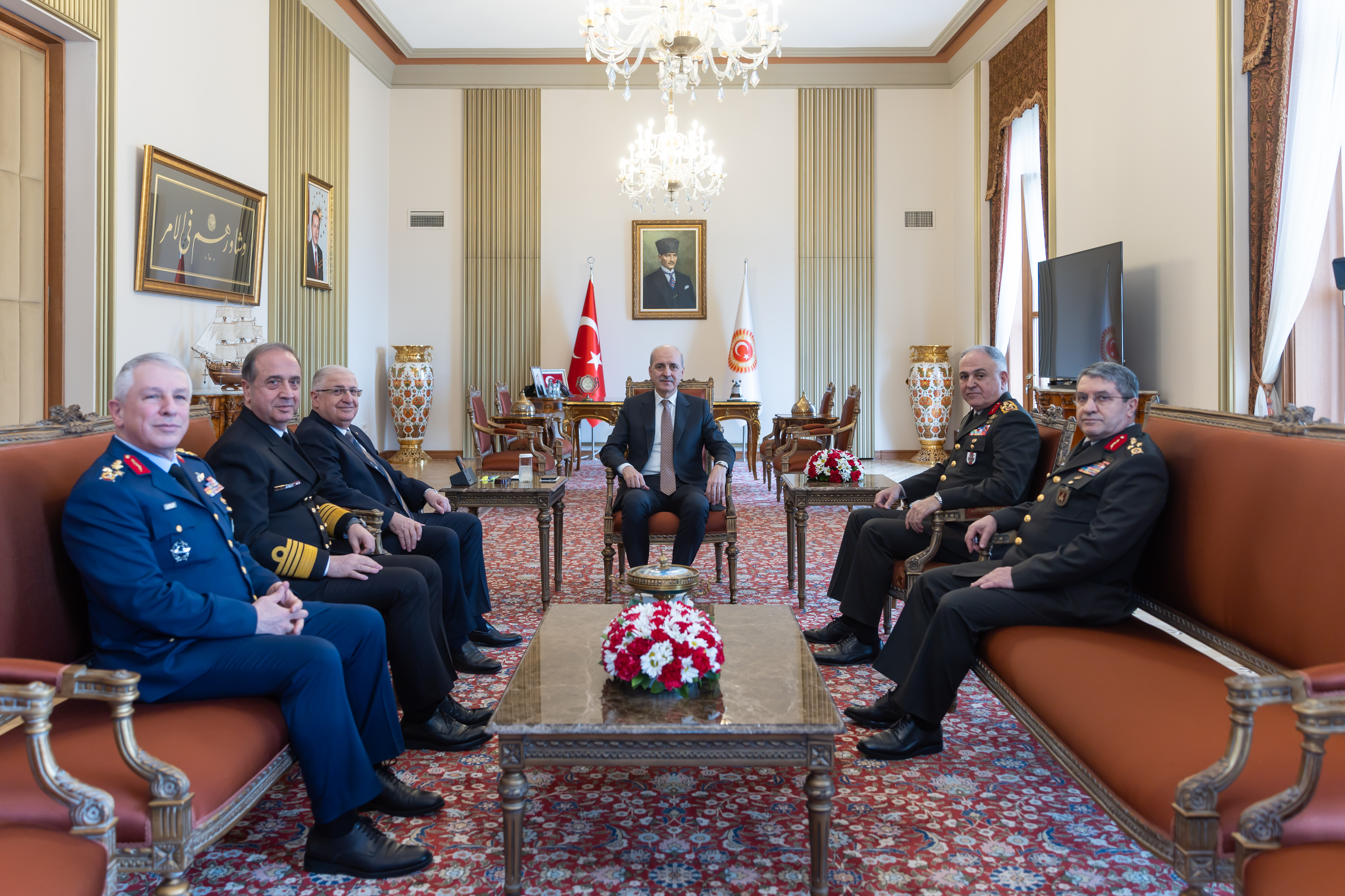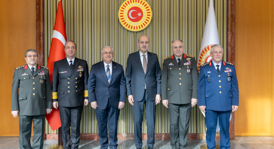 TBMM Başkanı Numan Kurtulmuş, Millî Savunma Bakanı Yaşar Güler ile Genelkurmay Başkanı Orgeneral Metin Gürak, Kara Kuvvetleri Komutanı Orgeneral Selçuk Bayraktaroğlu, Deniz Kuvvetleri Komutanı Oramiral Ercüment Tatlıoğlu ve Hava Kuvvetleri Komutanı Orgeneral Ziya Cemal Kadıoğlu’nu kabul etti.