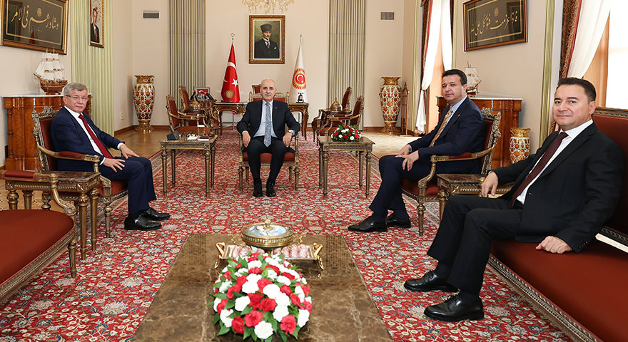 Türkiye Büyük Millet Meclisi Başkanı Numan Kurtulmuş, Saadet Partisi Genel Başkanı Mahmut Arıkan, DEVA Partisi Genel Başkanı Ali Babacan ve Gelecek Partisi Genel Başkanı Ahmet Davutoğlu’nu kabul etti.