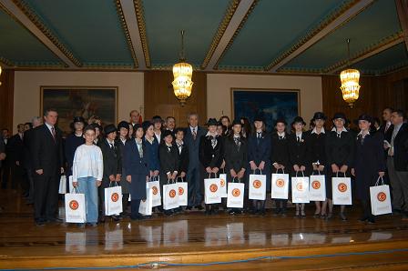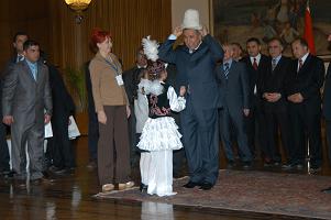 Kırgız çocukların hediyesi olan şapkayı takan Arınç, Kırım Tatar Meclis Başkanı Mustafa Cemiloğlu'nun Kırımlı çocuklarla kendisine gönderdiği şapkayı da giyerek, ''O bizim milli kahramanımız'' dedi.