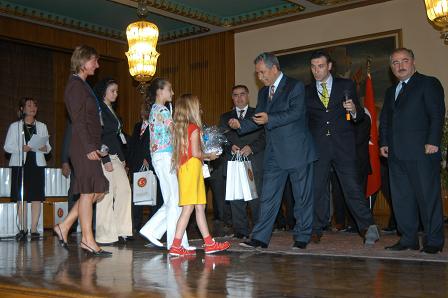Ukraynalı çocuklar Arınç'ı, Türkçe ''Sizlere Ukrayna'dan kucak dolusu selam getirdik'', Meksikalı çocuklar ise ''Ülkelerimiz birbirinden çok uzak olsa da kalplerimiz bir'' diyerek selamladı. Etkinliklere sponsor olan Koç Holding temsilcisine teşekkür ederek hediye veren Arınç, ''Her zaman sizi yanımızda görmek isteriz. TRT'li veya TRT'siz...'' dedi.