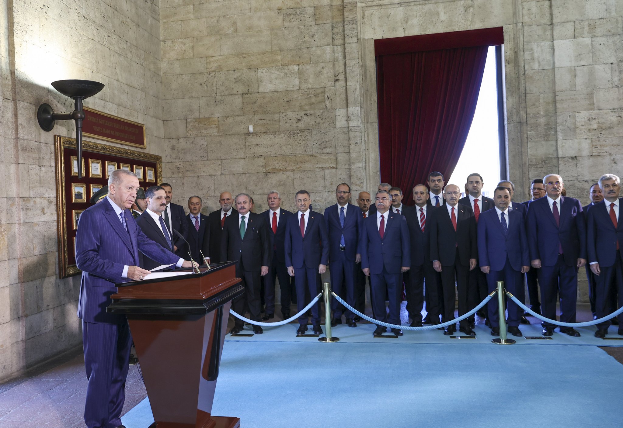 Cumhurbaşkanı Erdoğan'ın üzerinde ay yıldız bulunan çelengi Atatürk'ün mozolesine bırakmasının ardından saygı duruşunda bulunuldu ve İstiklal Marşı okundu. Daha sonra Erdoğan ve beraberindekiler, Misak-ı Milli Kulesi'ne geçti. Cumhurbaşkanı Erdoğan, burada Anıtkabir Özel Defteri'ne şunları yazdı: