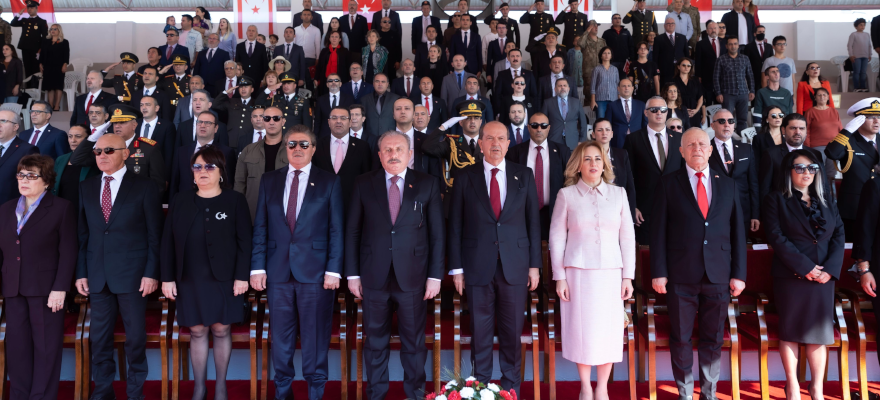 Törende, İstiklal Marşı'nın okunmasının ardından KKTC Cumhurbaşkanı Ersin Tatar, tören birliklerini denetledi, halkın bayramını kutladı.