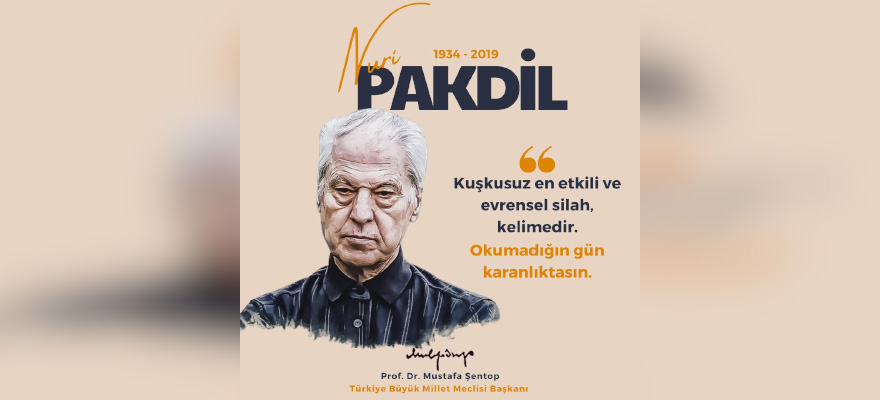 TBMM Başkanı Prof. Dr. Mustafa Şentop, Türk edebiyatının önemli isimlerinden yazar, şair ve düşünür Nuri Pakdil'in vefat yıl dönümü dolayısıyla sosyal medya hesabından paylaşımda bulundu.