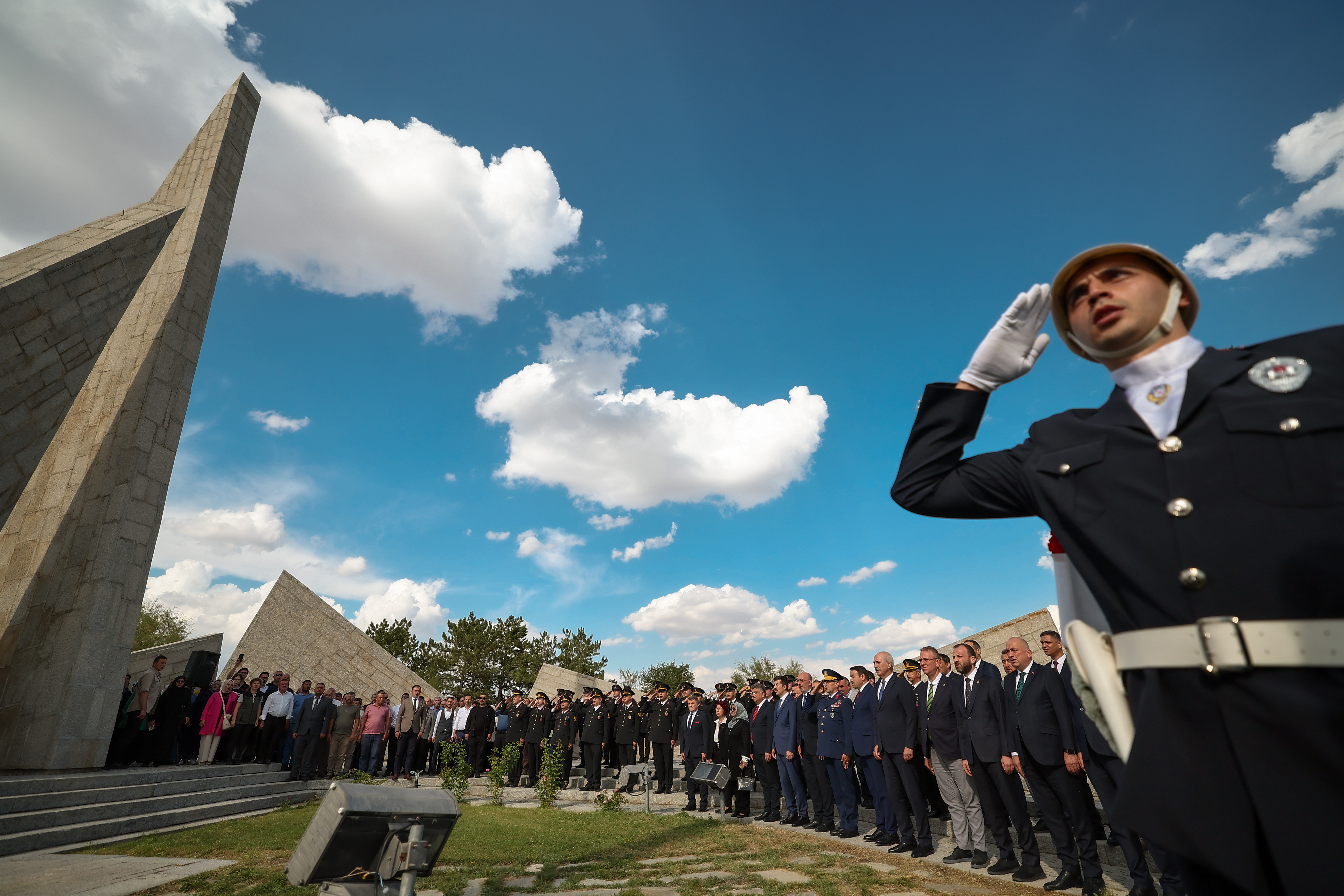 Zafer Abidesi’ndeki tören, şehitler için saygı duruşunda bulunulması ve İstiklal Marşı’nın okunmasıyla başladı.