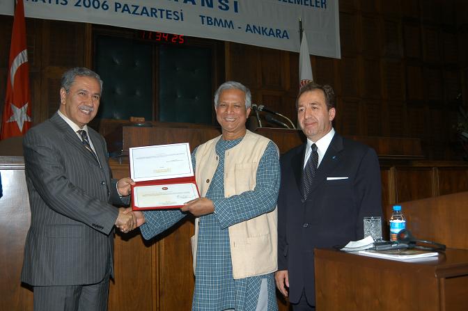 2006 Nobel Barış Ödülünü kazanan mikro kredi uygulamasının fikir babası Profesör Muhammed Yunus TBMM Başkanı Arınç'a gönderdiği teşekkür mektubunda "Bu uluslar arası tasdik ve sizlerin süre gelen desteği bizlere yoksulluğun olmadığı bir dünya kurma hayalimizi hayata geçirmek için daha sıkı çalışmamız için ilham vermektedir" dedi