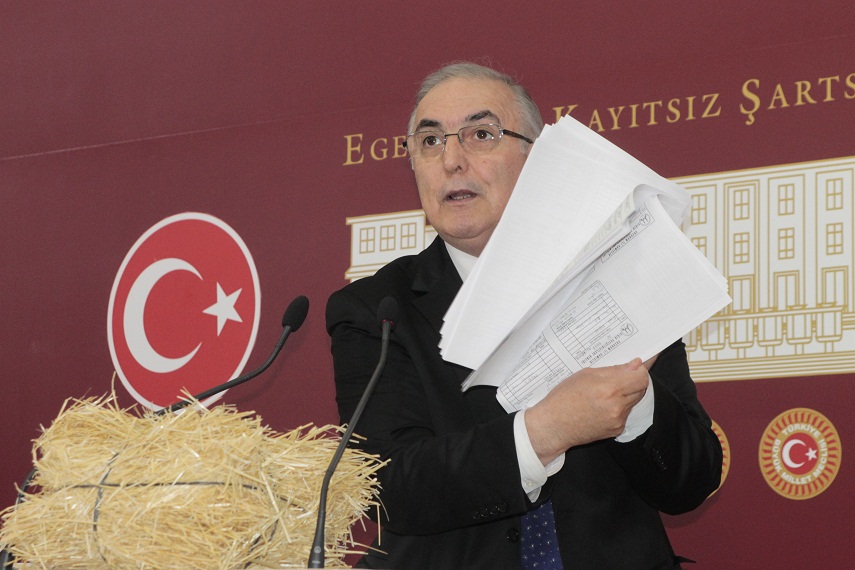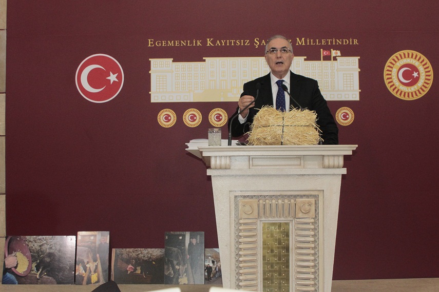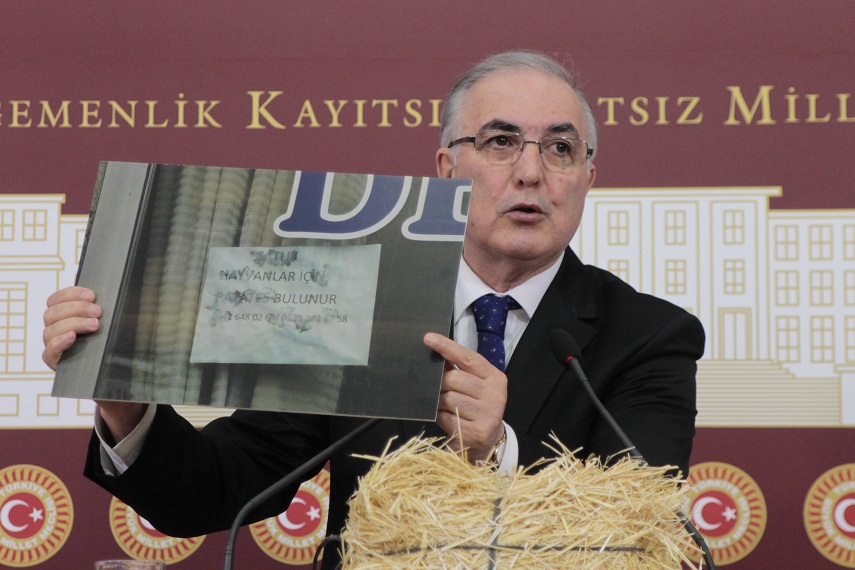 CHP Ardahan Milletvekili Ensar Öğüt, parlamentoda düzenlediği basın toplantısında küçük bir saman balyasını kürsüye koyarak "Erzurum Pasinler'de bırakın makarnayı, hayvanlara artık patates yediriyorlar.'' dedi.