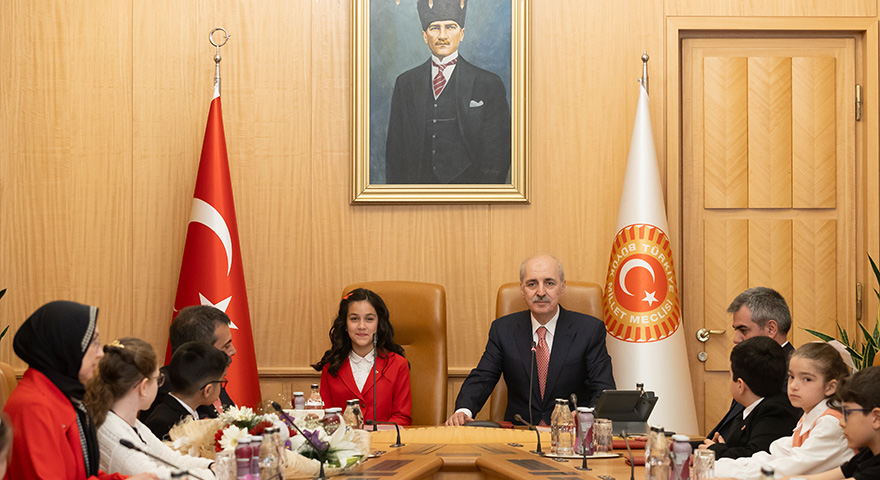 Çocukları TBMM'de ağırlamaktan memnuniyet duyduğunu belirten Kurtulmuş, dün TBMM Genel Kurulu'nda koltuğunu Aysima Arslan'a devrettiğini ve Meclis'i çok iyi yönettiğini anımsattı. Katip üyeler ve geleceğin milletvekillerinin de güzel bir oturum gerçekleştirdiğini vurgulayan Kurtulmuş, çocukları tebrik etti.