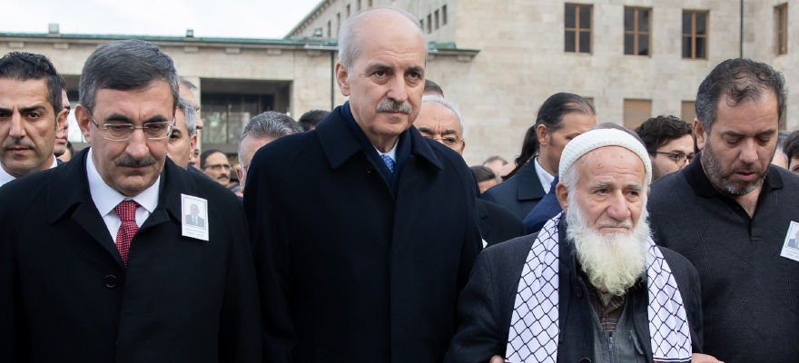 Hasan Bitmez'in Türk bayrağına sarılı tabutuna Saadet Partisi Hatay Milletvekili Necmettin Çalışkan tarafından Filistin bayrağı konuldu.