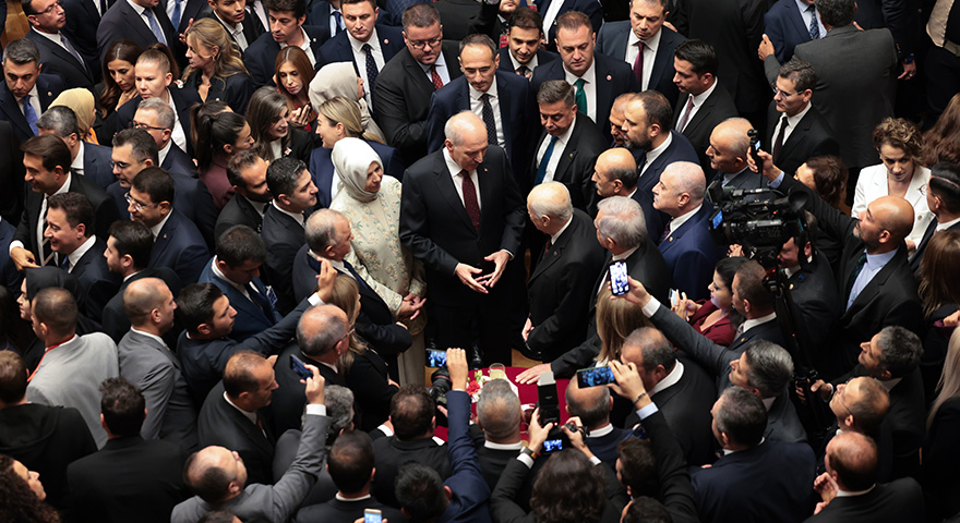 TBMM Genel Kurulunda yeni yasama yılı açılışı sırasında Özel ve Bakırhan ile tokalaşmasının sorulmasına karşılık Bahçeli, "Yeni bir döneme giriyoruz. Dünyada barış isterken kendi ülkemizde barışı sağlamak lazım." yanıtını verdi.