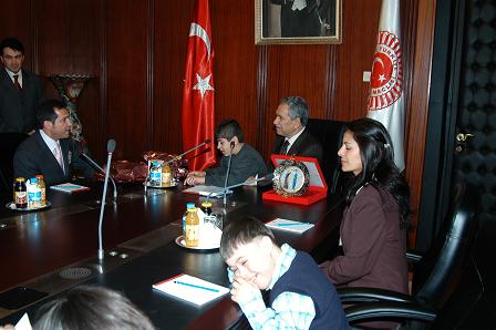 TBMM Başkanı Arınç, bir süre önce öğretmenleriyle birlikte kendisine mektup yazarak Ankara'yı görmek istediklerini belirten Elazığ Eğitim Uygulama ve İş Eğitim Merkezi Okulu'nda eğitim gören zihinsel engelli çocukları kabul etti.