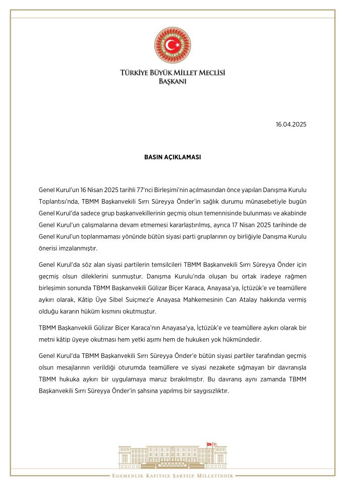 "Genel Kurul’un 16 Nisan 2025 tarihli 77’nci Birleşimi’nin açılmasından önce yapılan Danışma Kurulu Toplantısı’nda, TBMM Başkanvekili Sırrı Süreyya Önder’in sağlık durumu münasebetiyle bugün Genel Kurul’da sadece grup başkanvekillerinin geçmiş olsun temennisinde bulunması ve akabinde Genel Kurul’un çalışmalarına devam etmemesi kararlaştırılmış, ayrıca 17 Nisan 2025 tarihinde de Genel Kurul’un toplanmaması yönünde bütün siyasi parti gruplarının oy birliğiyle Danışma Kurulu önerisi imzalanmıştır.