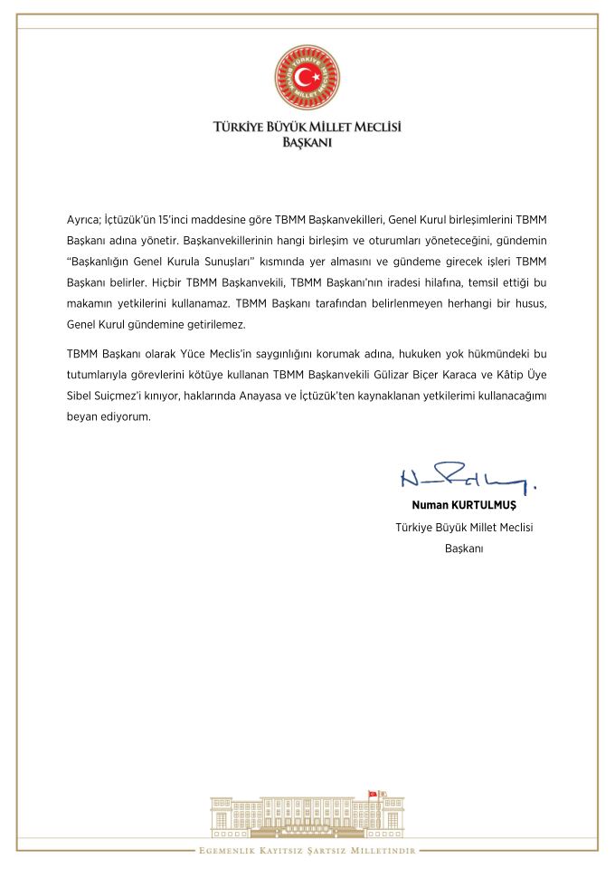 TBMM Başkanı olarak Yüce Meclis’in saygınlığını korumak adına, hukuken yok hükmündeki bu tutumlarıyla görevlerini kötüye kullanan TBMM Başkanvekili Gülizar Biçer Karaca ve Kâtip Üye Sibel Suiçmez’i kınıyor, haklarında Anayasa ve İçtüzük’ten kaynaklanan yetkilerimi kullanacağımı beyan ediyorum."