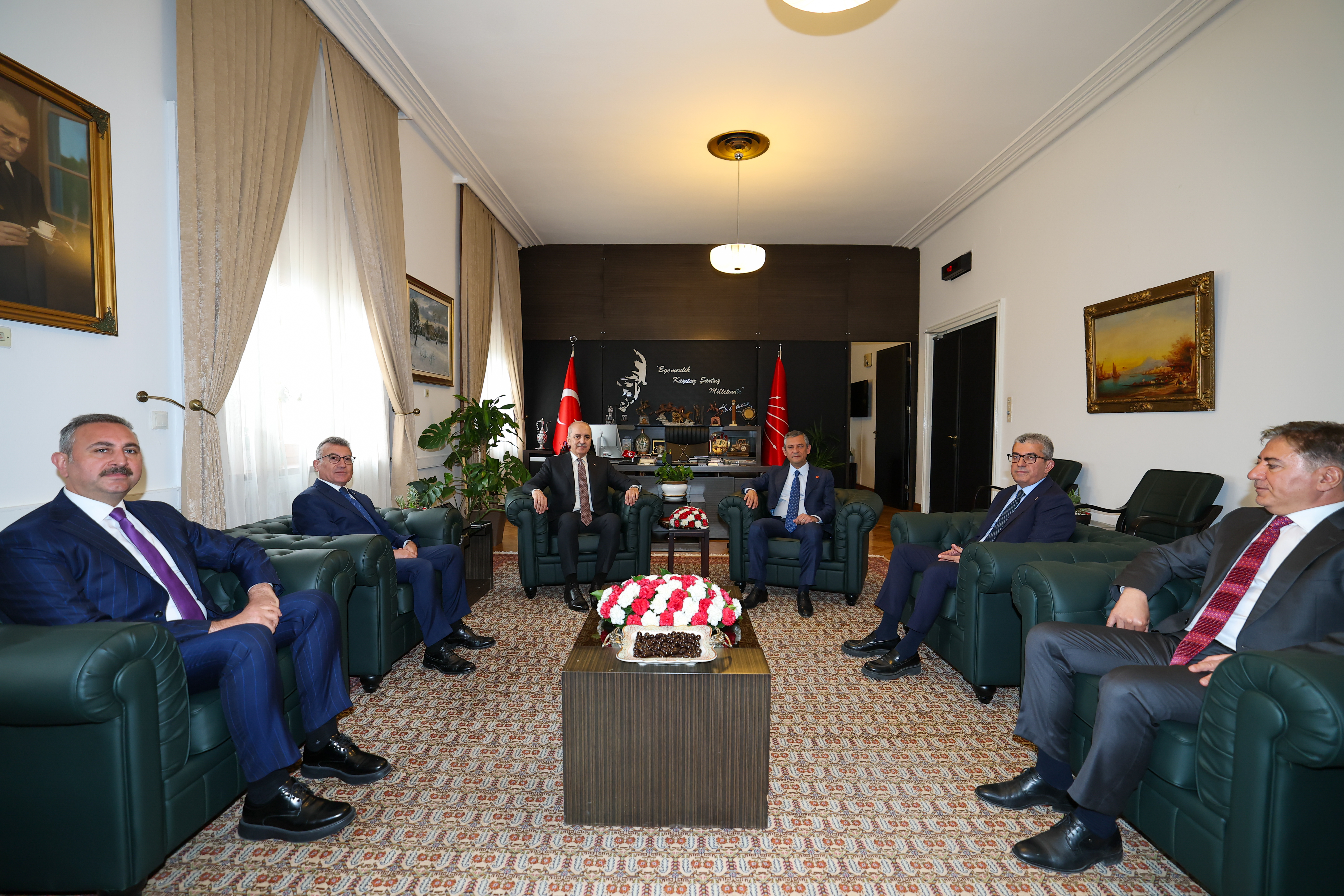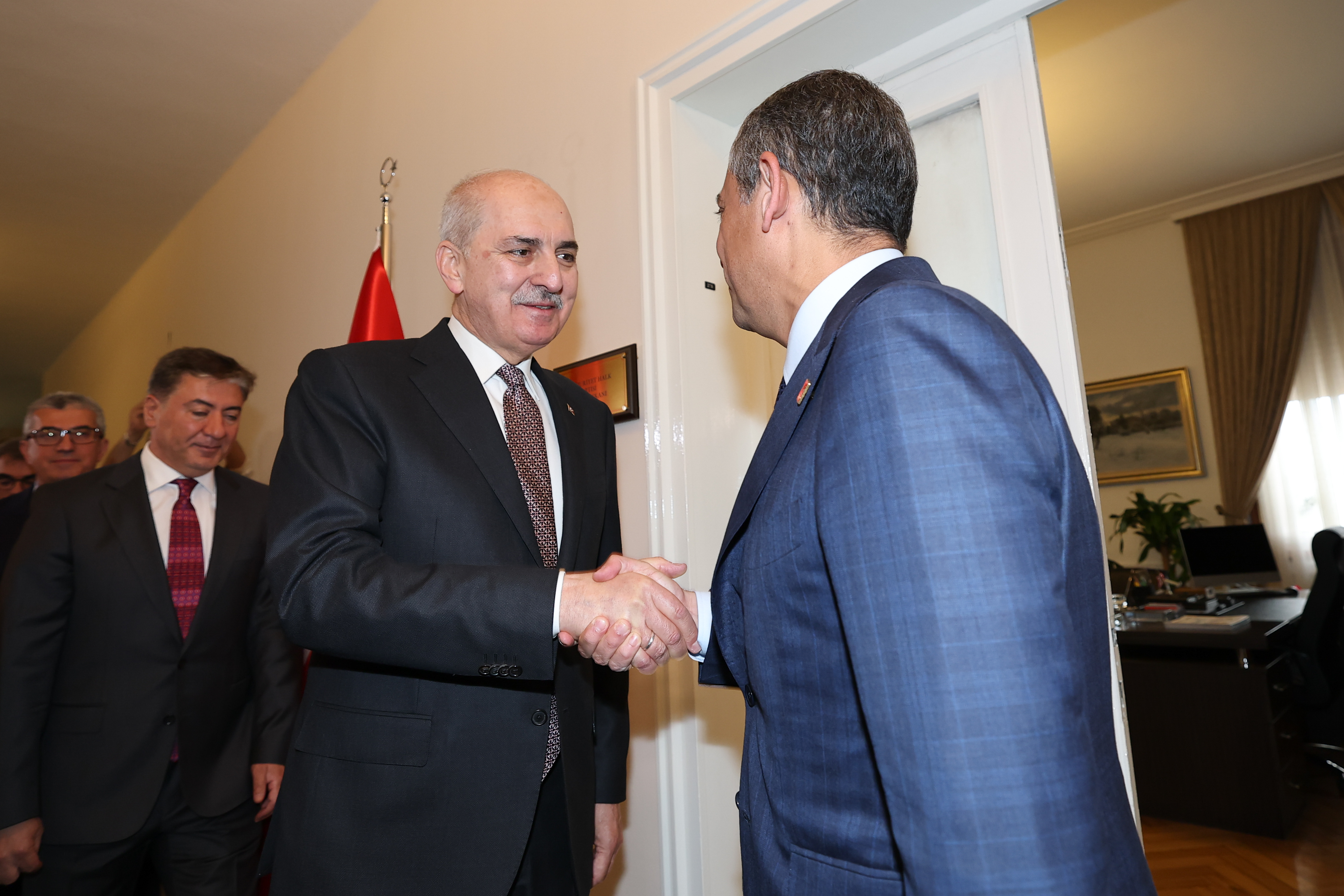 TBMM Başkanı Kurtulmuş, Kurtulmuş, AK Parti Grup Başkanı Abdullah Güler ve AK Parti Grup Başkanvekili Abdulhamit Gül ile CHP Genel Başkanı Özgür Özel’i Meclis’teki parti grubunda ziyaret etti.