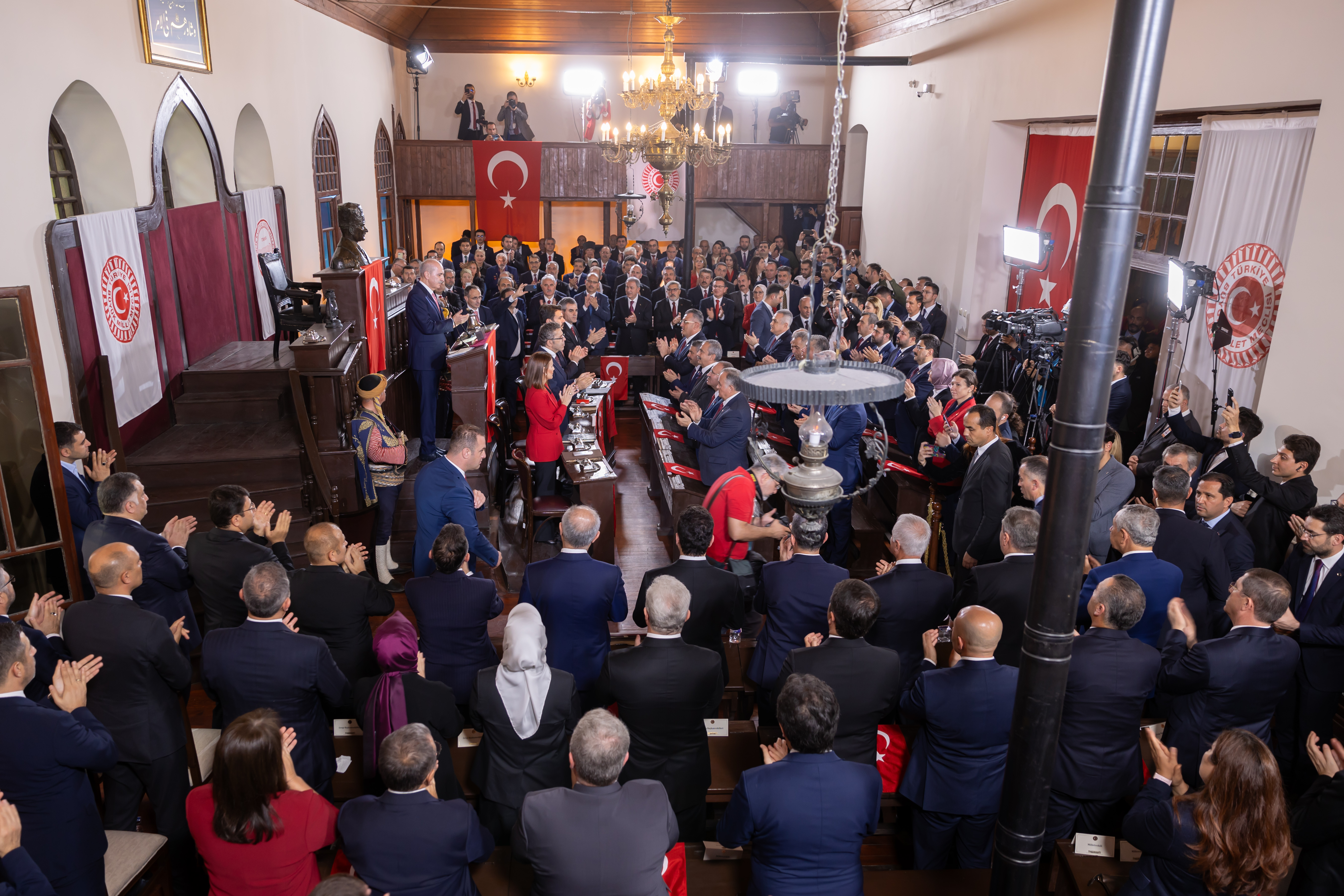 TBMM Başkanı Kurtulmuş’u, Birinci Meclis Binası’na gelişinde Ankara Seymenleri karşıladı. Tören kapsamında Gazi Mustafa Kemal Atatürk’ün Cumhurbaşkanı seçilmesinin ardından Meclis’te yaptığı konuşma okundu.
