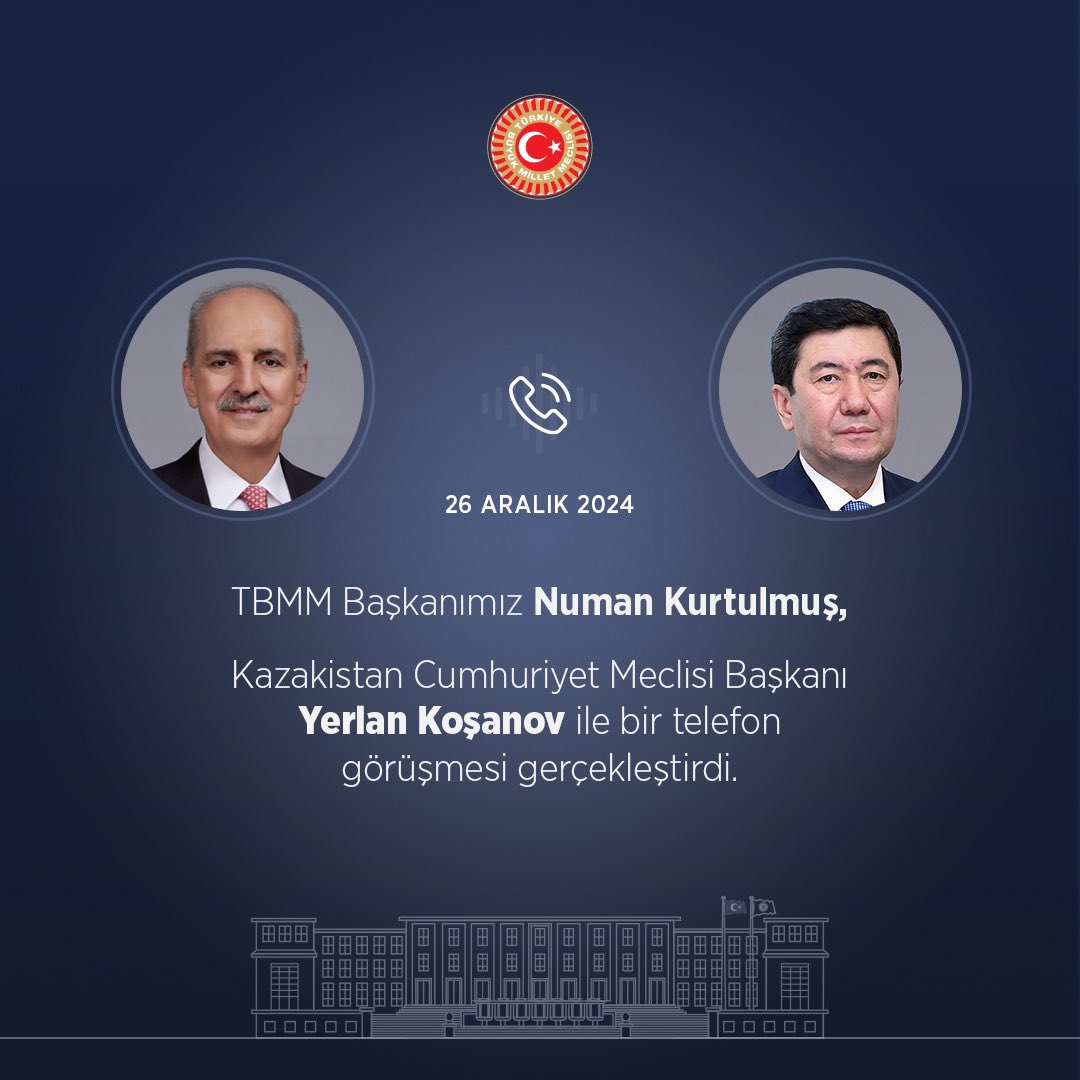 TBMM Başkanı Numan Kurtulmuş, Azerbaycan Hava Yollarına ait yolcu uçağının Kazakistan'ın Aktau kenti yakınlarında düşmesi nedeniyle Kazakistan Cumhuriyet Meclisi Başkanı Yerlan Koşanov’u telefonla aradı.