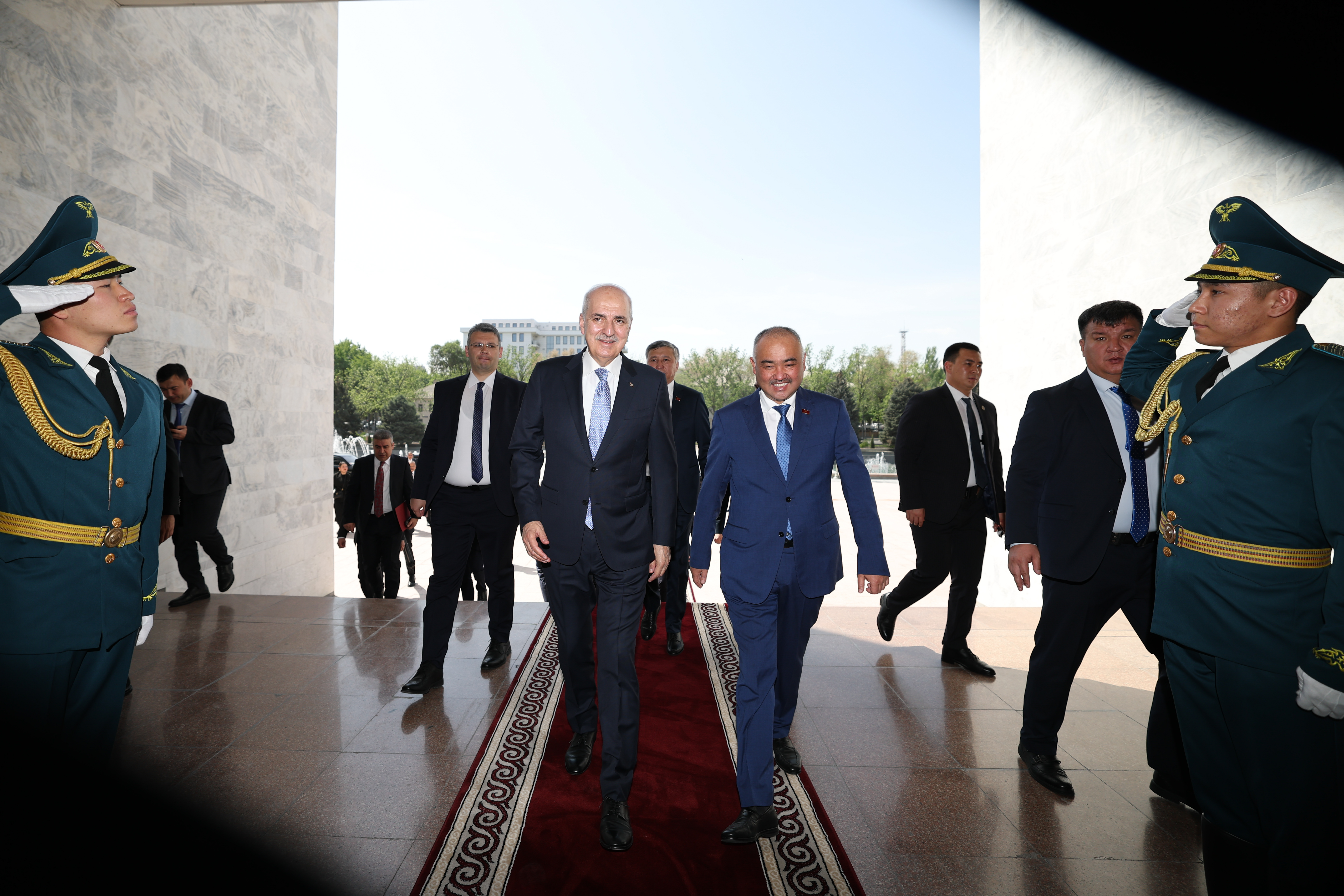 Kurtulmuş, resmi ziyaret gerçekleştirdiği Bişkek’te, meclis binasına gelişinde, Kırgızistan Jogorku Keneş Başkanı Nurlanbek Turgunbek Uulu tarafından karşılanandı.