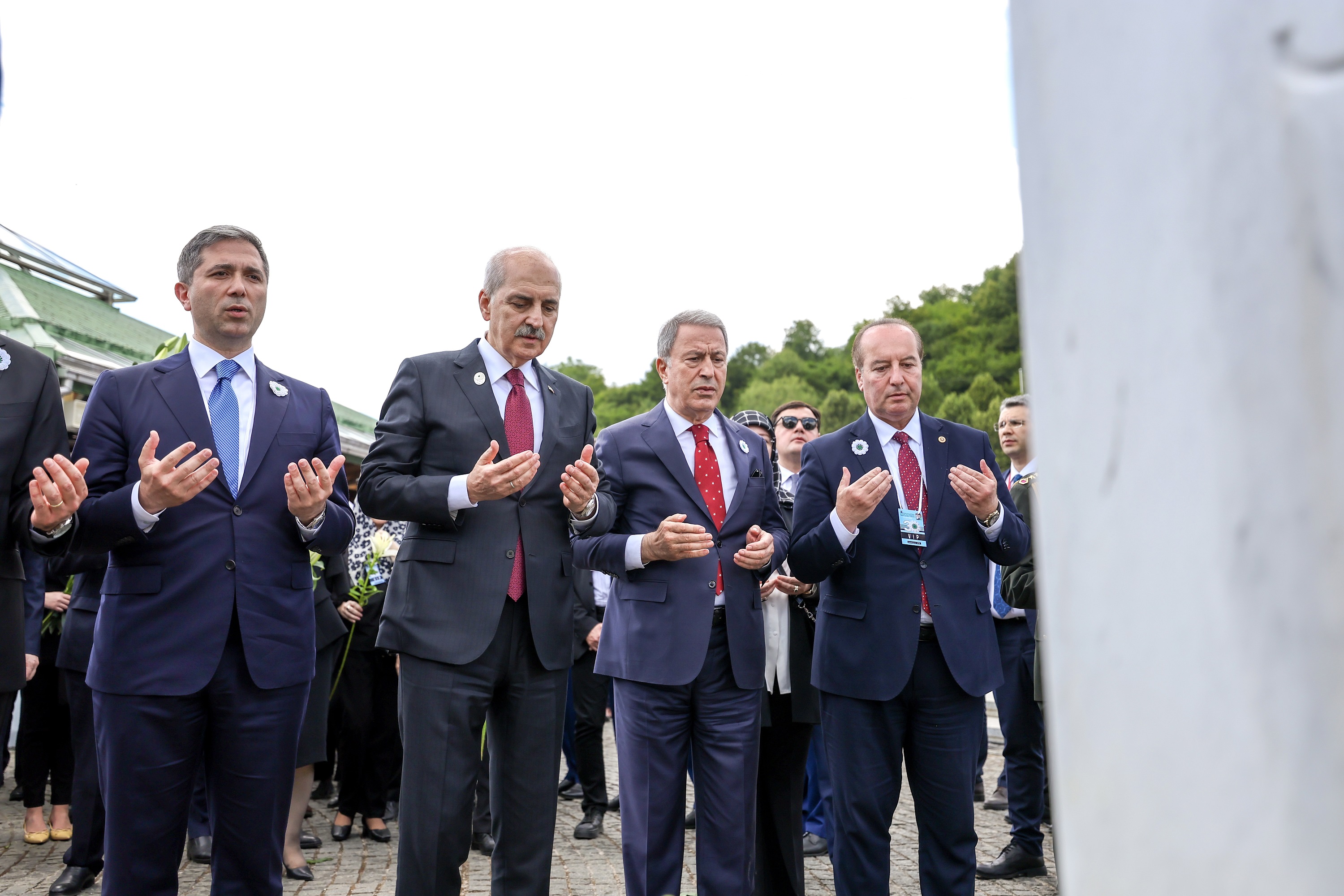 Tören öncesi, TBMM Başkanı Kurtulmuş’un katılımıyla birçok ülkeden cumhurbaşkanı, başbakan ve bakan ile ülke temsilci tarafından anıt merkezine çiçek bırakıldı.