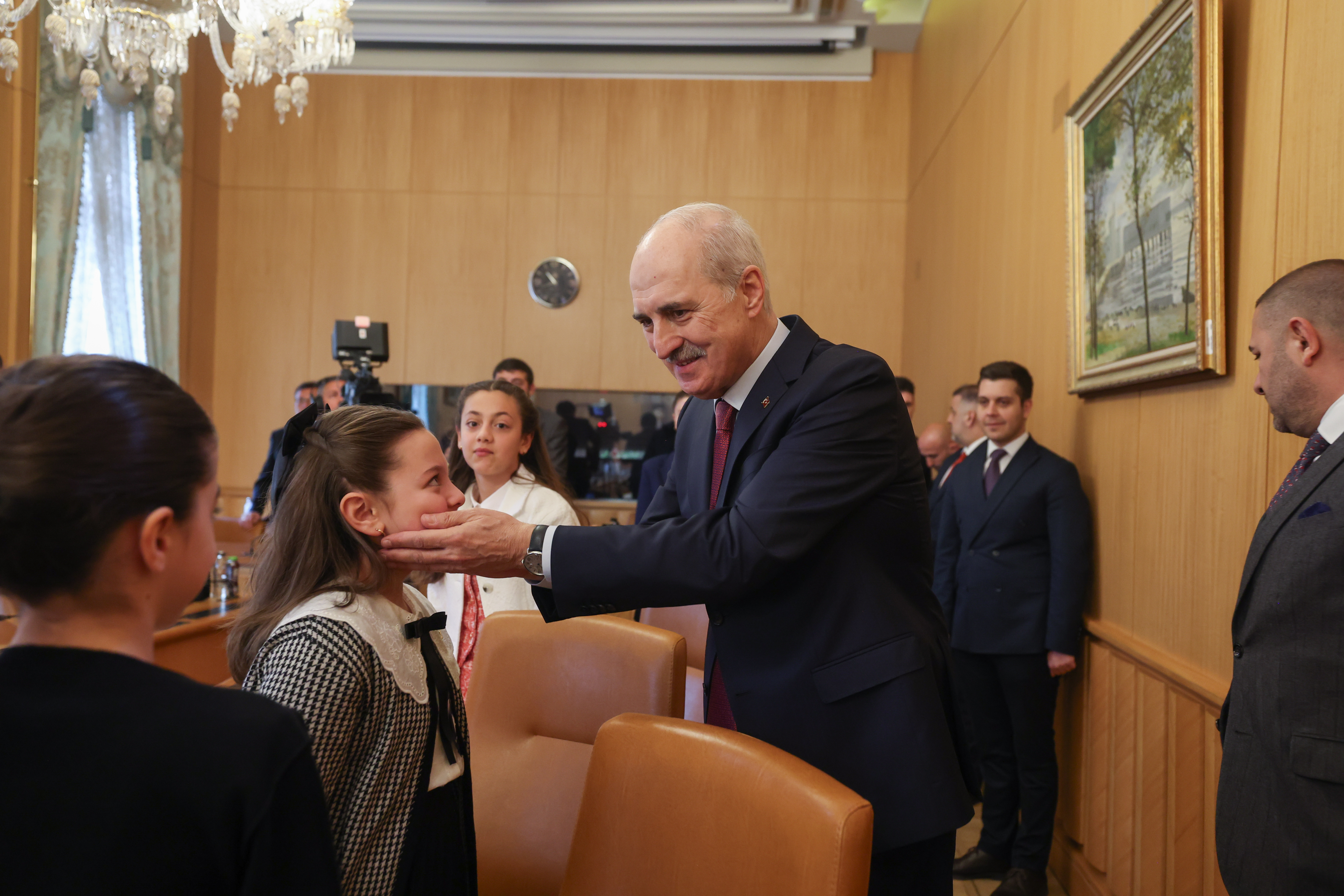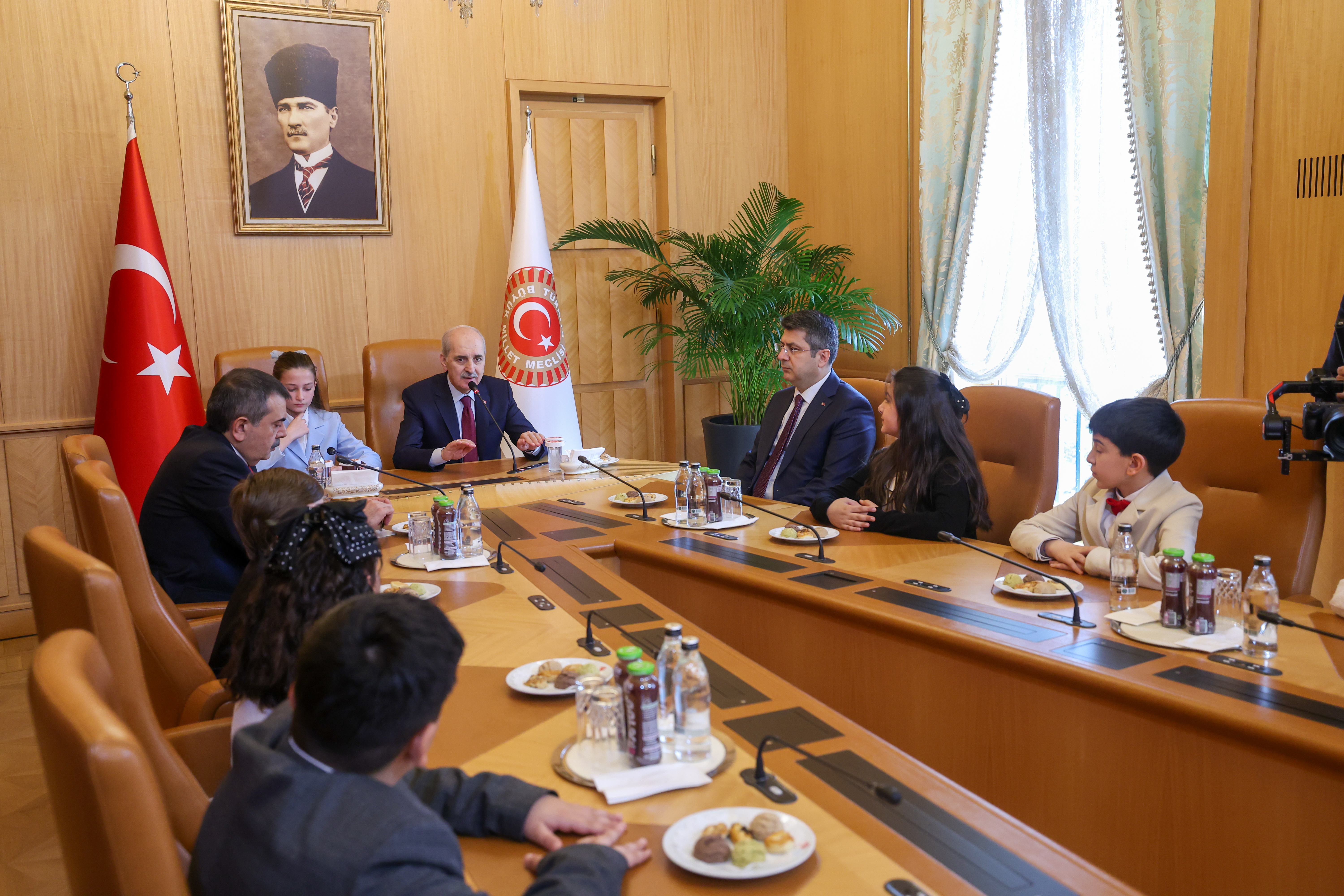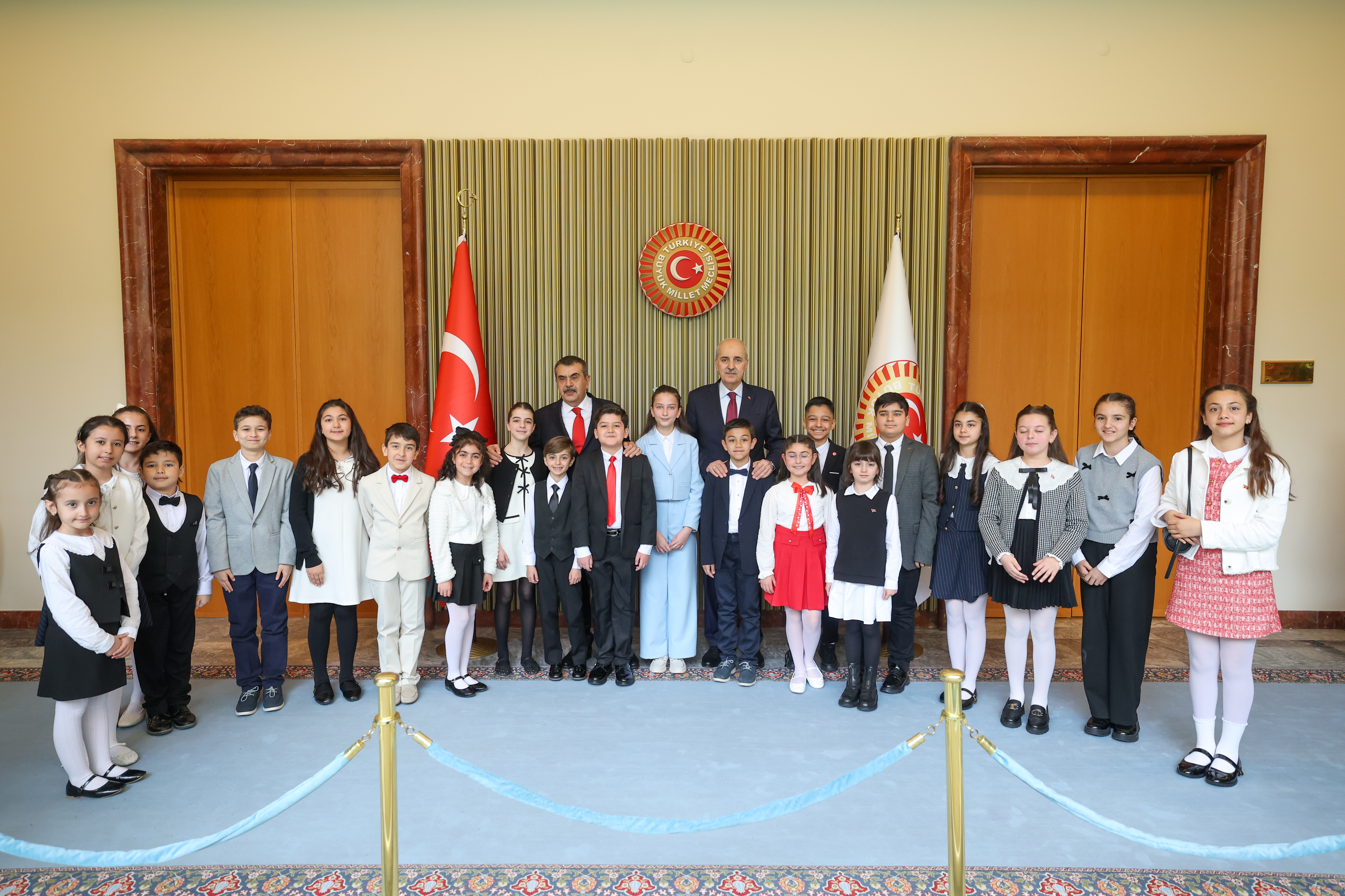 Kurtulmuş, TBMM Başkanlığı Divan Salonu'nda, Milli Eğitim Bakanı Yusuf Tekin ile çeşitli okullardan gelen öğrenci ve öğretmenleri, 23 Nisan Ulusal Egemenlik ve Çocuk Bayramı kutlamaları kapsamında kabul etti.