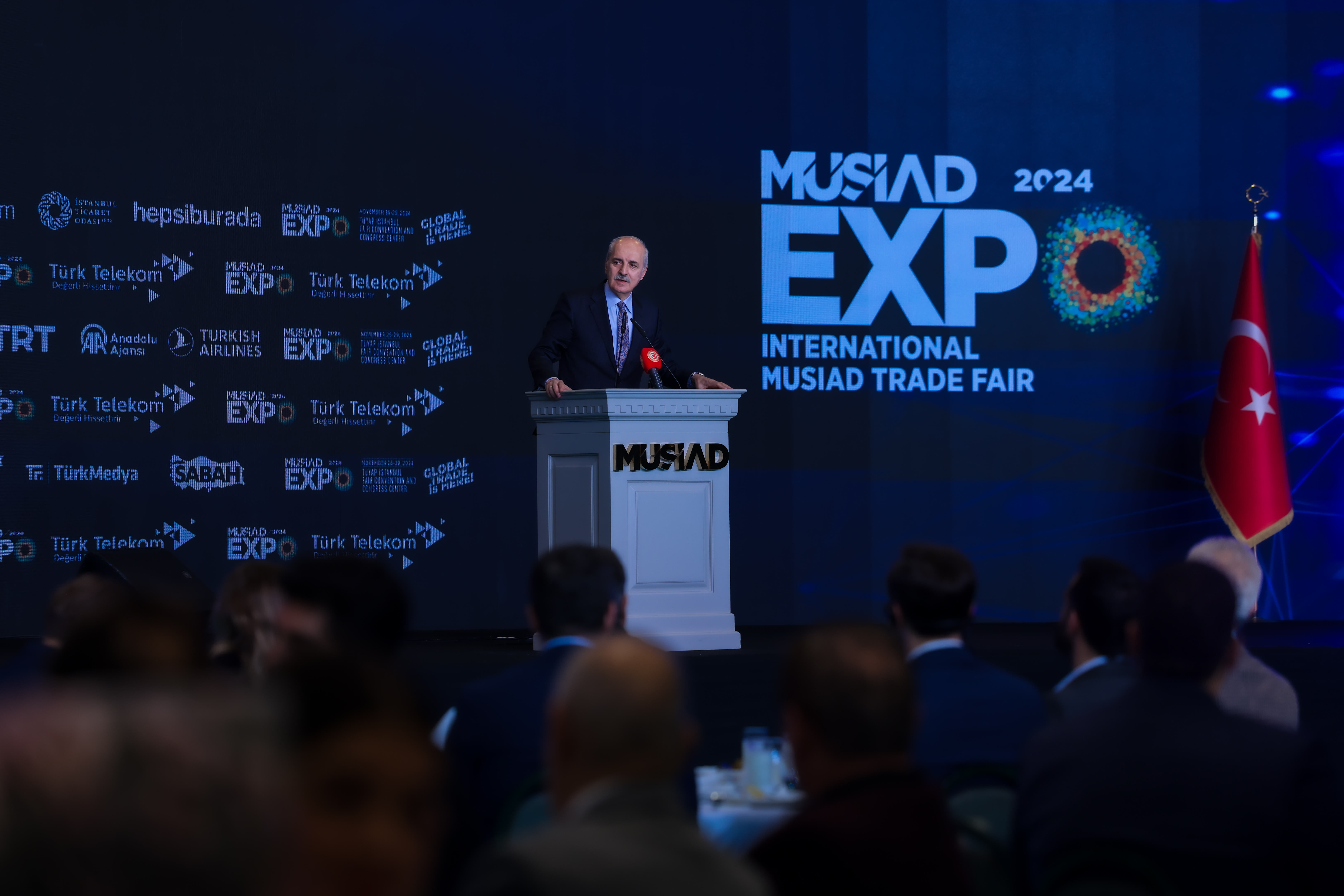 “Küresel Ticaret Burada” sloganının, EXPO bünyesinde hem kurum olarak MÜSİAD’ın hem de Türkiye’nin taşıdığı iddiayı ifade etmesi bakımından dikkat çekici olduğunu vurgulayan Kurtulmuş, “Türkiye, bir taraftan tarihi İpek Yolu’nun ortasında olması, bütün ticaret yerlerine yakın bir mesafede bulunması, jeostratejik konumu, etrafındaki bütün türbülanslara rağmen ekonomik ve siyasi istikrarını koruyabilme becerisiyle bugün dünyada, özellikle önümüzdeki dönemdeki kapıları sonuna kadar açılmış olan çok kutuplu yeni dünya sistemi içerisinde yıldızı parlayan ender ülkelerden birisidir.” ifadesini kullandı.