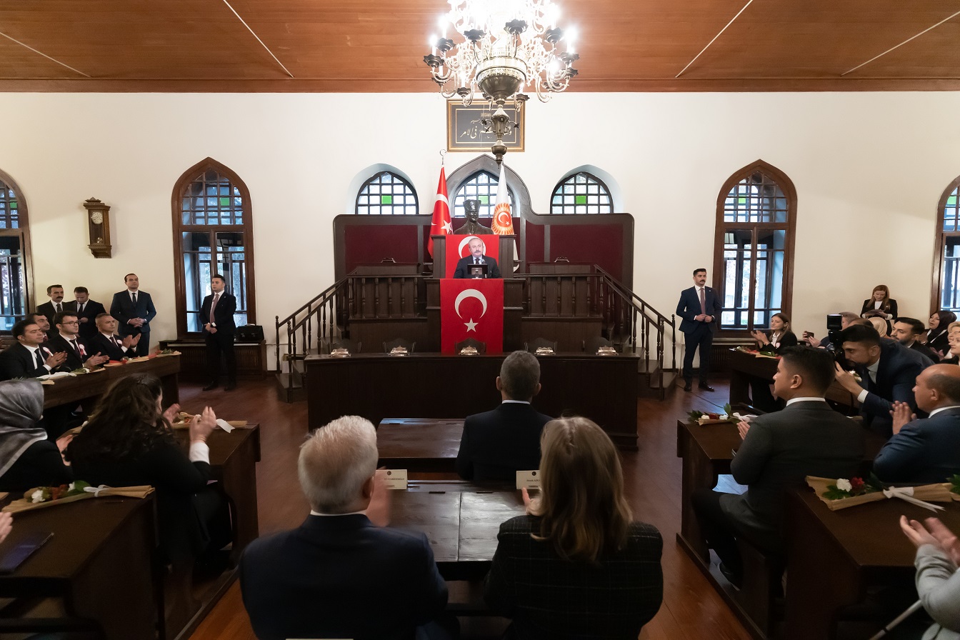 "Bu binanın Meclis olarak kullanılmasına karar verildiğinde çatısında kiremitleri yoktu. İnsanlar evlerinin çatısından söküp getirdikleri kiremitlerle bu binanın çatısını yaptılar. Gördüğünüz gaz lambası bir kahvehaneden alınıp getirildi. Sizleri burada ağırlamamızın en önemli sebebi ise şu anda oturduğunuz sıralardır. O sıralar, yokluk içerisindeki, bir savaştan yeni çıkmış milletimizin öğretmenleri ve öğrencileri tarafından Ankara sokaklarında taşınarak buraya getirildi. Siz öğretmenlerimiz ile o tarihi, o şuuru birlikte hissedelim, okul sıralarından oluşmuş Meclisimizde bir araya gelelim, 'Millet Mektepleri'nin açıldığı ve ilk Meclis başkanımız Gazi Mustafa Kemal Atatürk'e 'başöğretmenlik' unvanının verildiği bu anlamlı güne burada birlikte başlayalım istedim."