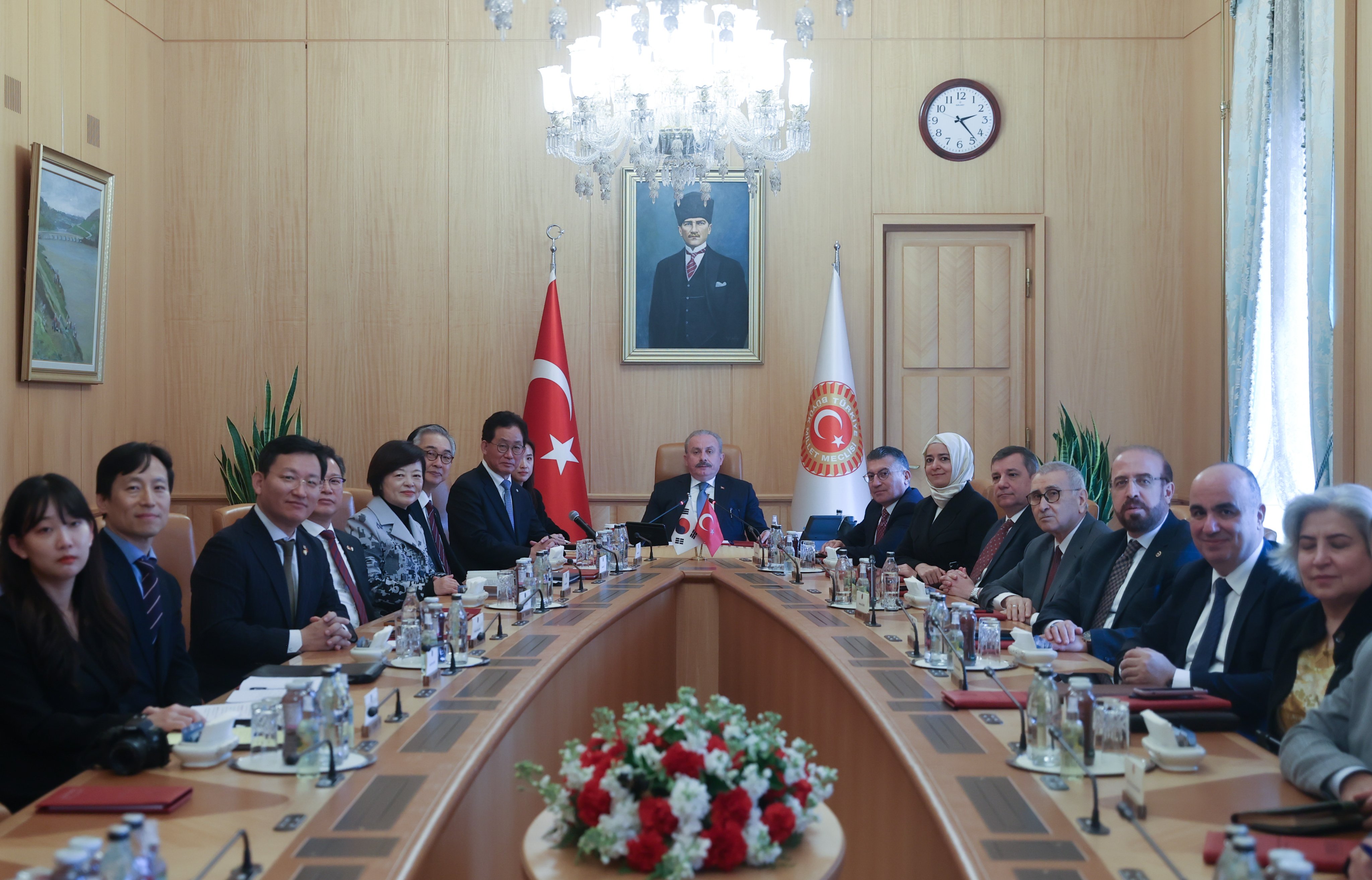 "Kore-Türkiye Parlamentolar Arası Dostluk Grubu Başkanı Yoo Ki-Hong ve beraberindeki Parlamento heyetini Meclisimizde kabul ettik. İki ülke halkları ve hükûmetleri arasındaki köklü ilişkileri, Parlamentolarımız arasındaki teması da artırarak güçlendirme arzumuzu ifade ettik."