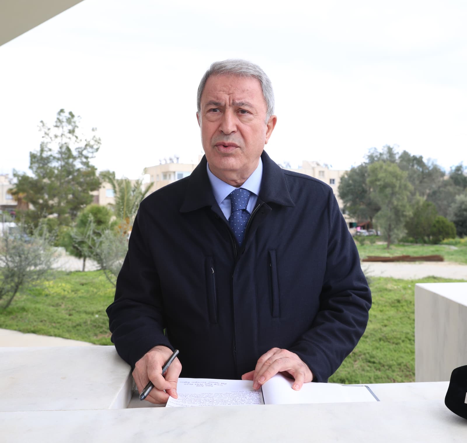 Anıt mezarda saygı duruşunda bulunan ve anıt özel defterini imzalayan TBMM Milli Savunma Komisyonu Başkanı Hulusi Akar, Serdar Denktaş ile bir süre sohbet etti.