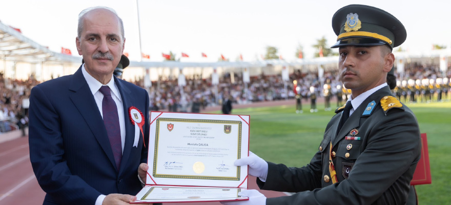 MSÜ Rektörü Prof. Dr. Erhan Afyoncu ve Kara Harp Okulu Komutanı Tümgeneral Gültekin Yaralı'nın da konuşma yaptığı törende, MSÜ Kara Harp Okulu devre birincisi Melisa Kılınç, yeni teğmenlere mezuniyet andını yaptırdı. Mezuniyet andının ardından Kılınç, yaş kütüğüne dönem yıldız ve plaketini çaktı. Dönem birincisi Kılınç, diplomasını Cumhurbaşkanı Erdoğan'ın elinden aldı.