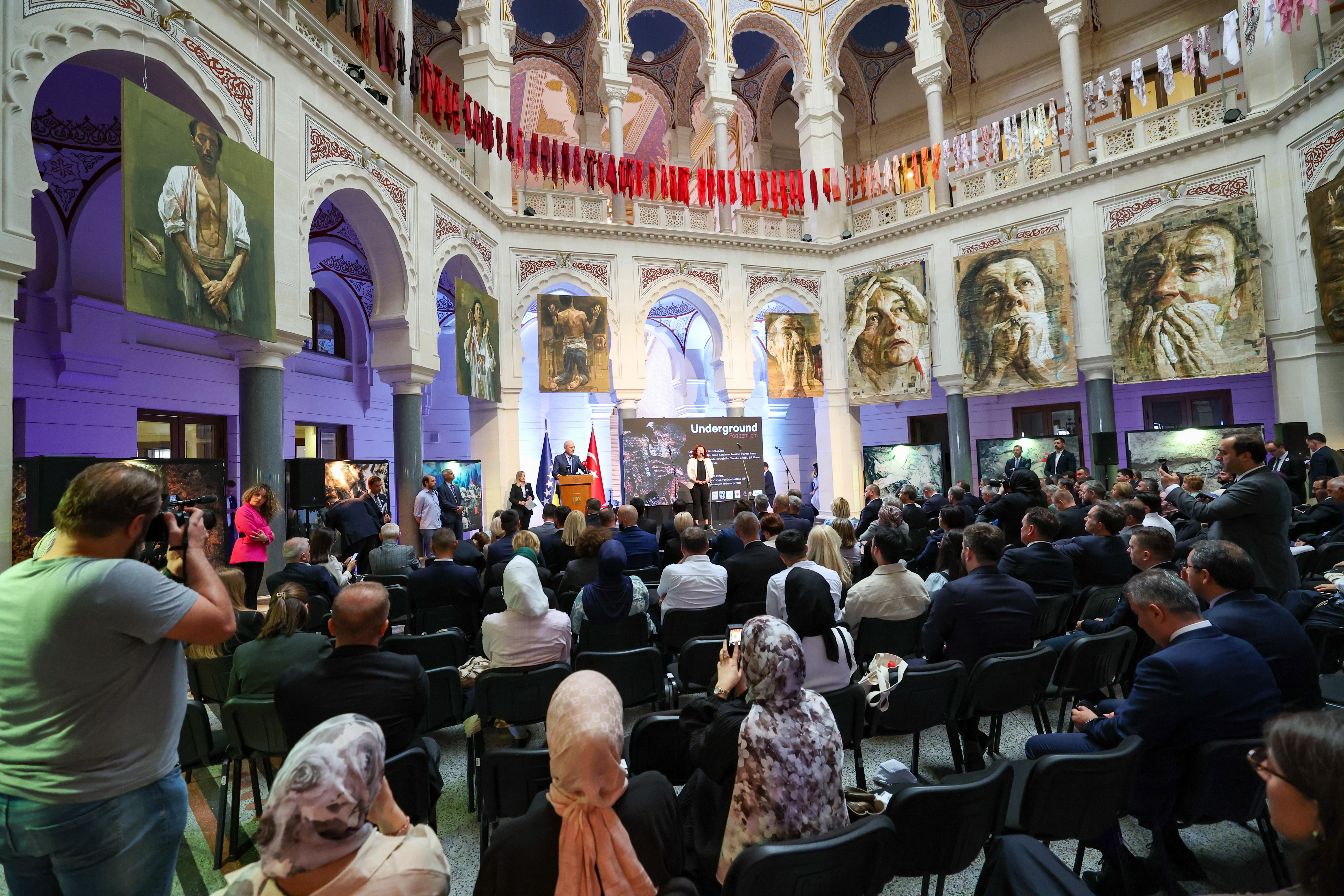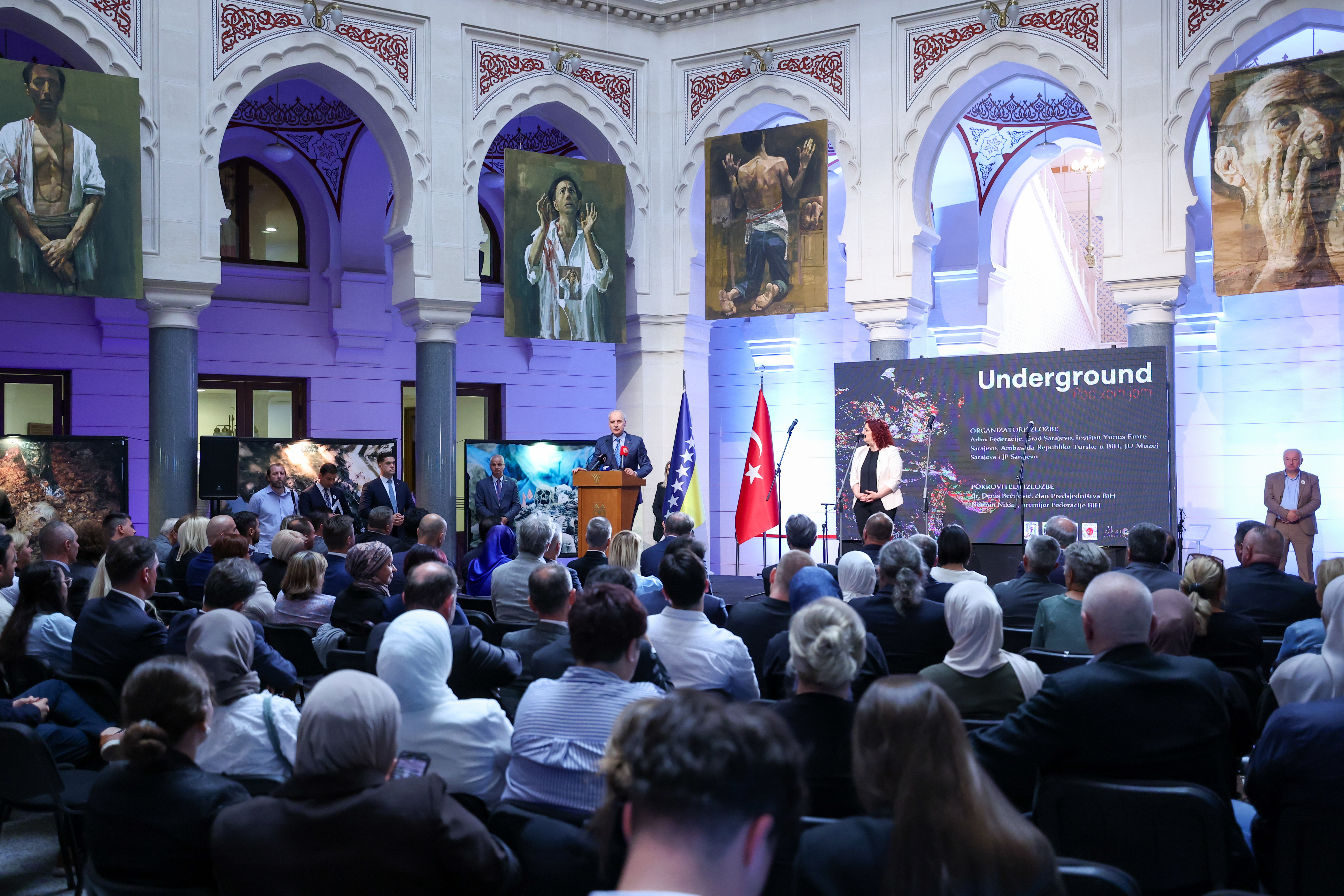 Resmi ziyaret kapsamında Bosna Hersek'in başkenti Saraybosna'da bulunan TBMM Başkanı Kurtulmuş, Türkiye’nin Saraybosna Büyükelçiliği, Saraybosna Yunus Emre Enstitüsü, Bosna Hersek Federasyonu Arşivi ve Saraybosna Büyükşehir Belediyesi iş birliğiyle Srebrenitsa soykırımının 30'uncu yılı dolayısıyla Saraybosna’daki tarihi Vijecnica Kütüphanesi’nde gerçekleştirilen "Yer Altında" (Underground) başlıklı serginin açılışına katıldı.