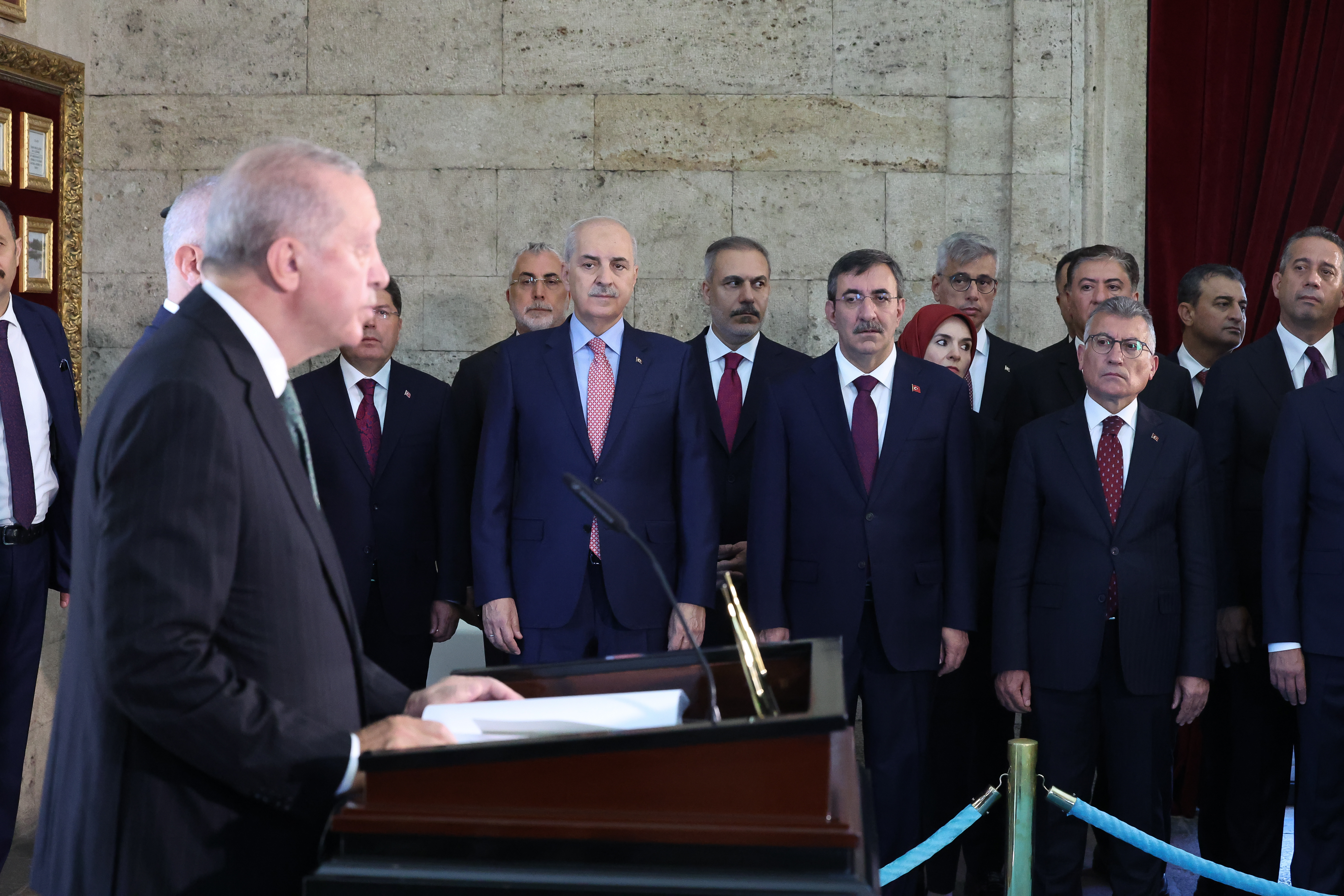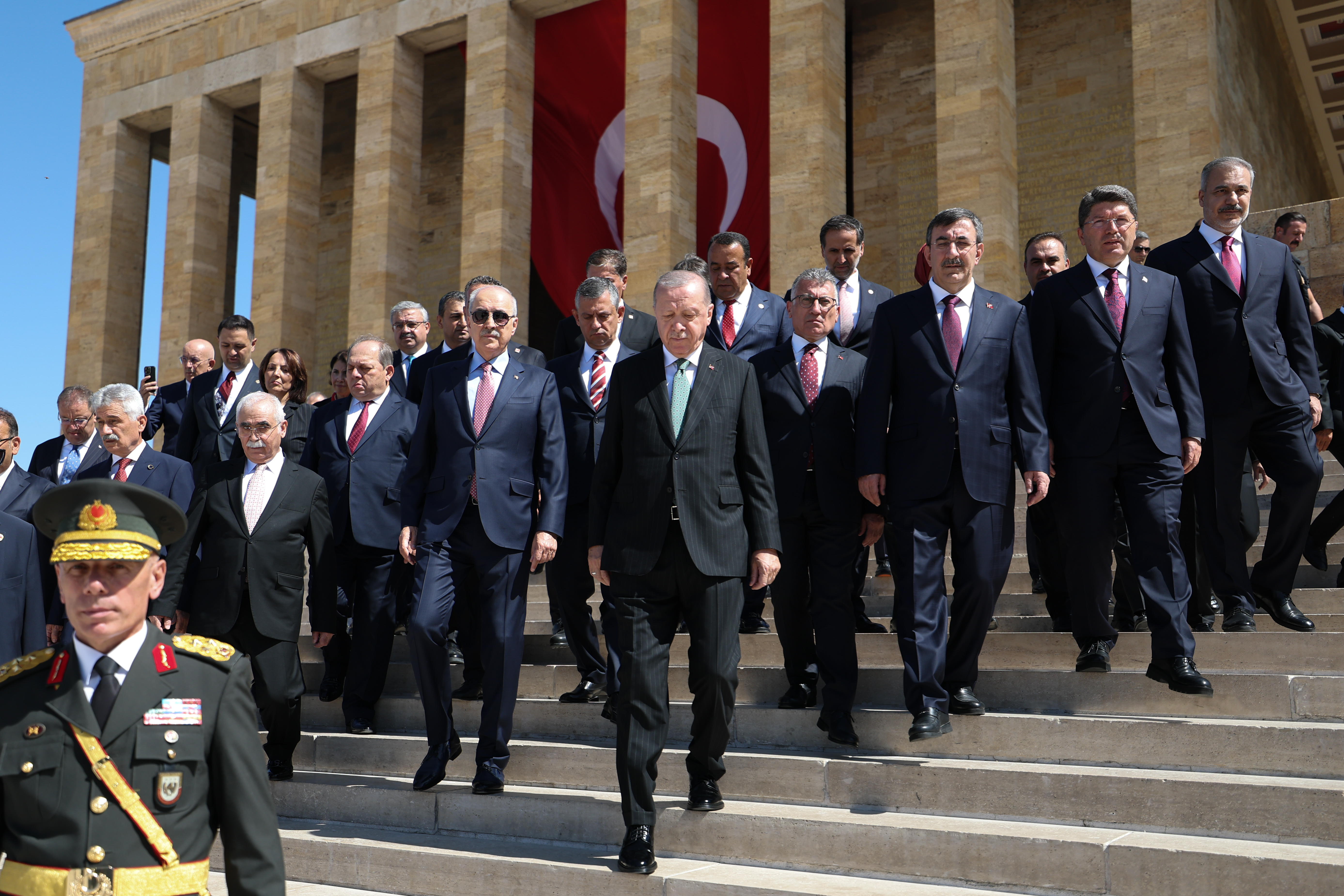 Erdoğan, Atatürk'ün mozolesine ay yıldız motifli çelenk bıraktı. Saygı duruşunun ardından İstiklal Marşı okundu.