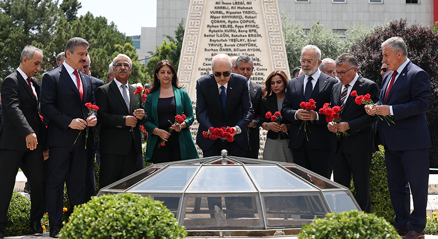 Kurtulmuş ve beraberindekiler, 15 Temmuz gecesi FETÖ mensuplarınca TBMM'ye atılan ilk bombanın düştüğü alanda yer alan anıta karanfil bıraktı.