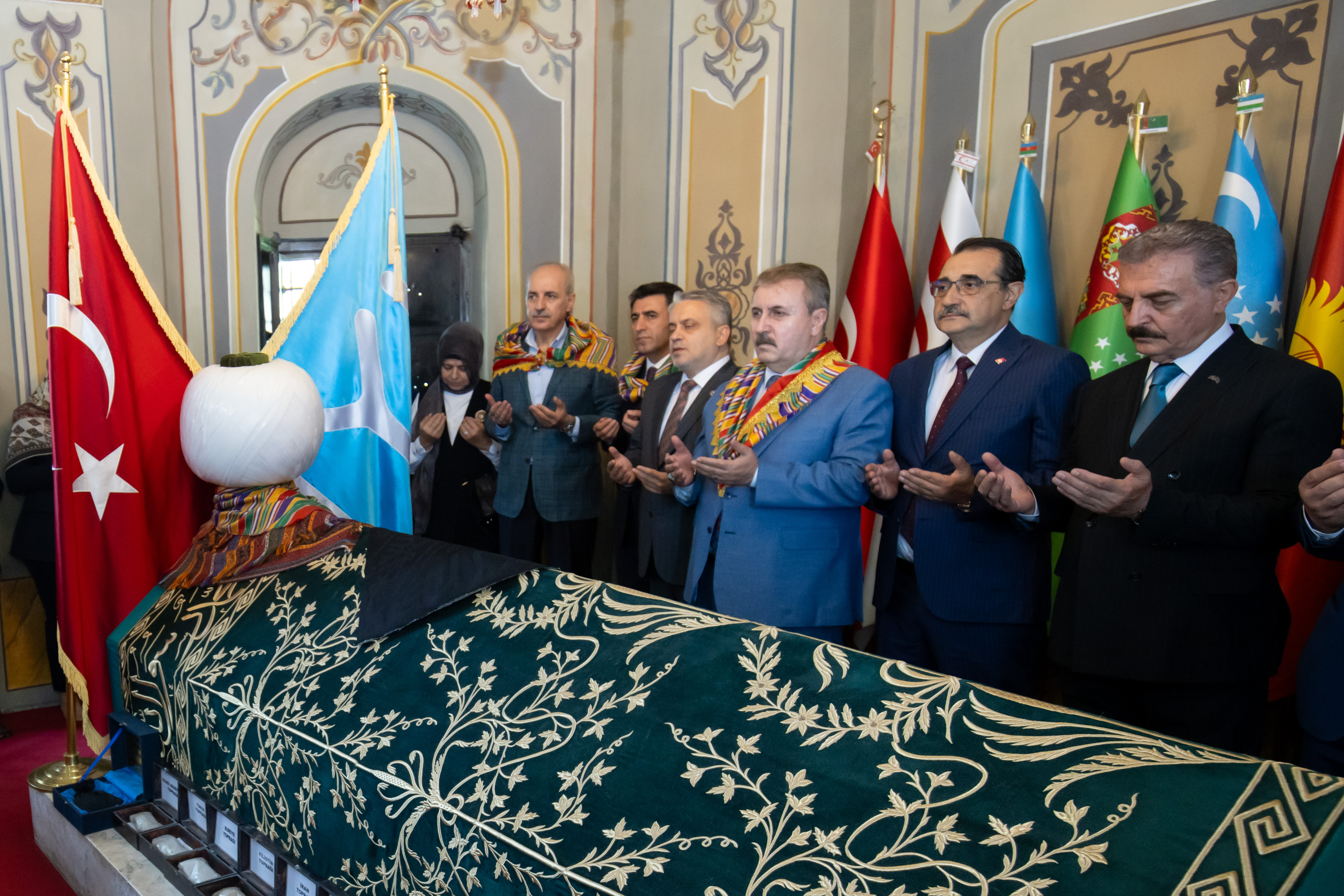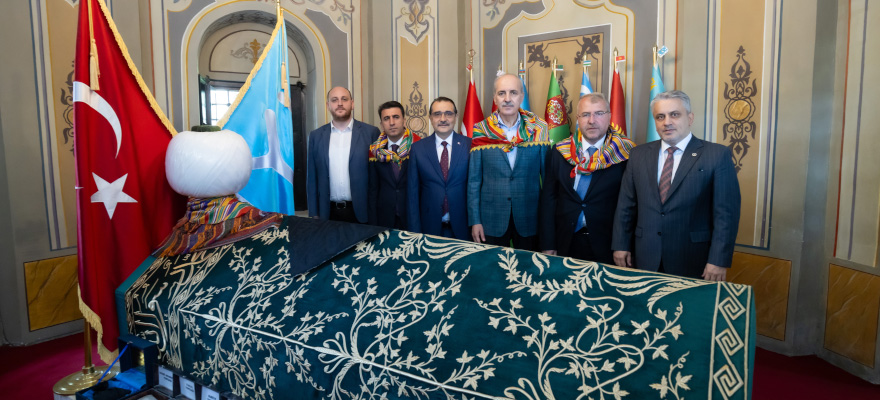 Meclis Başkanı Kurtulmuş, türbeyi ziyareti sırasında sanduka üzerine Kabe örtüsü bıraktı ve ardından dua etti.