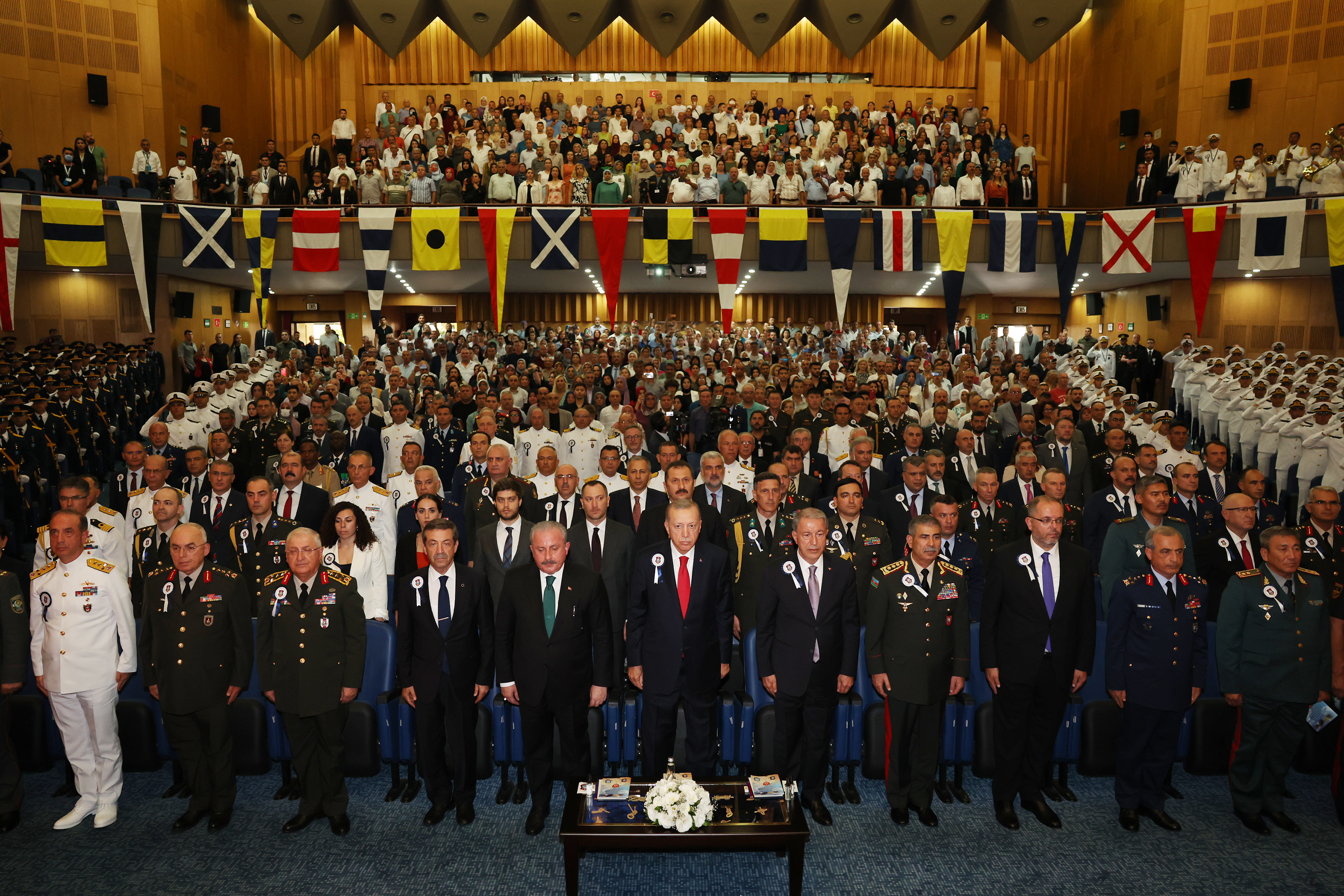 Deniz Harp Okulu'ndan mezun olan 269 Türk ve 6 misafir öğrenci ile Hava Harp Okulu'ndan mezun olan 273 Türk ve 13 misafir öğrenciyi tebrik eden Erdoğan, bu evlatları yetiştirerek ordunun saflarına katılmalarını sağlayan ailelerine de şahsı ve milleti adına teşekkürlerini sundu.