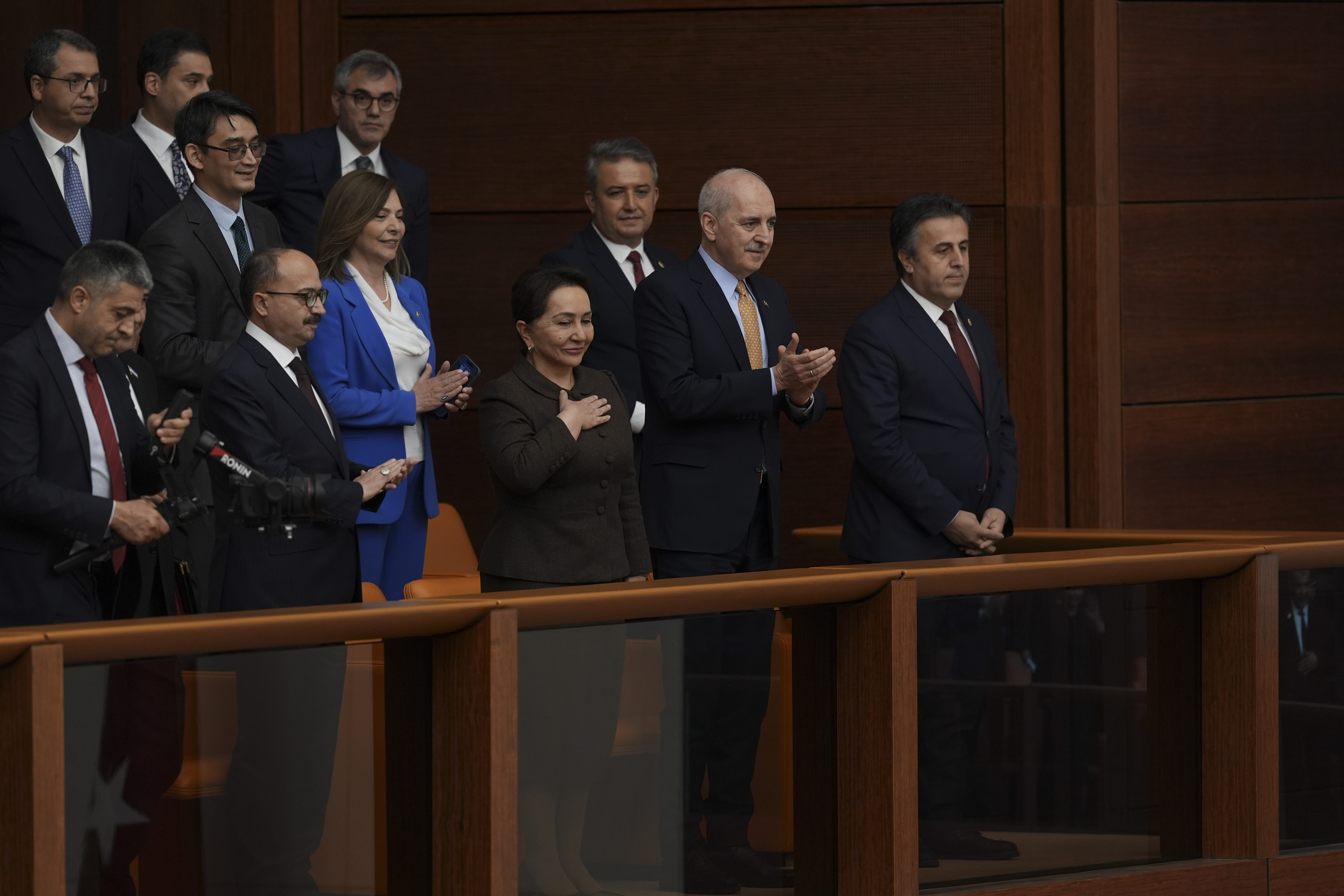 TBMM Başkanı Kurtulmuş, Narbayeva’yı Meclis’e gelişinde karşılamasının ardından Türkiye ve Özbekistan bayrakları önünde el sıkışarak basın mensuplarına görüntü verdi.