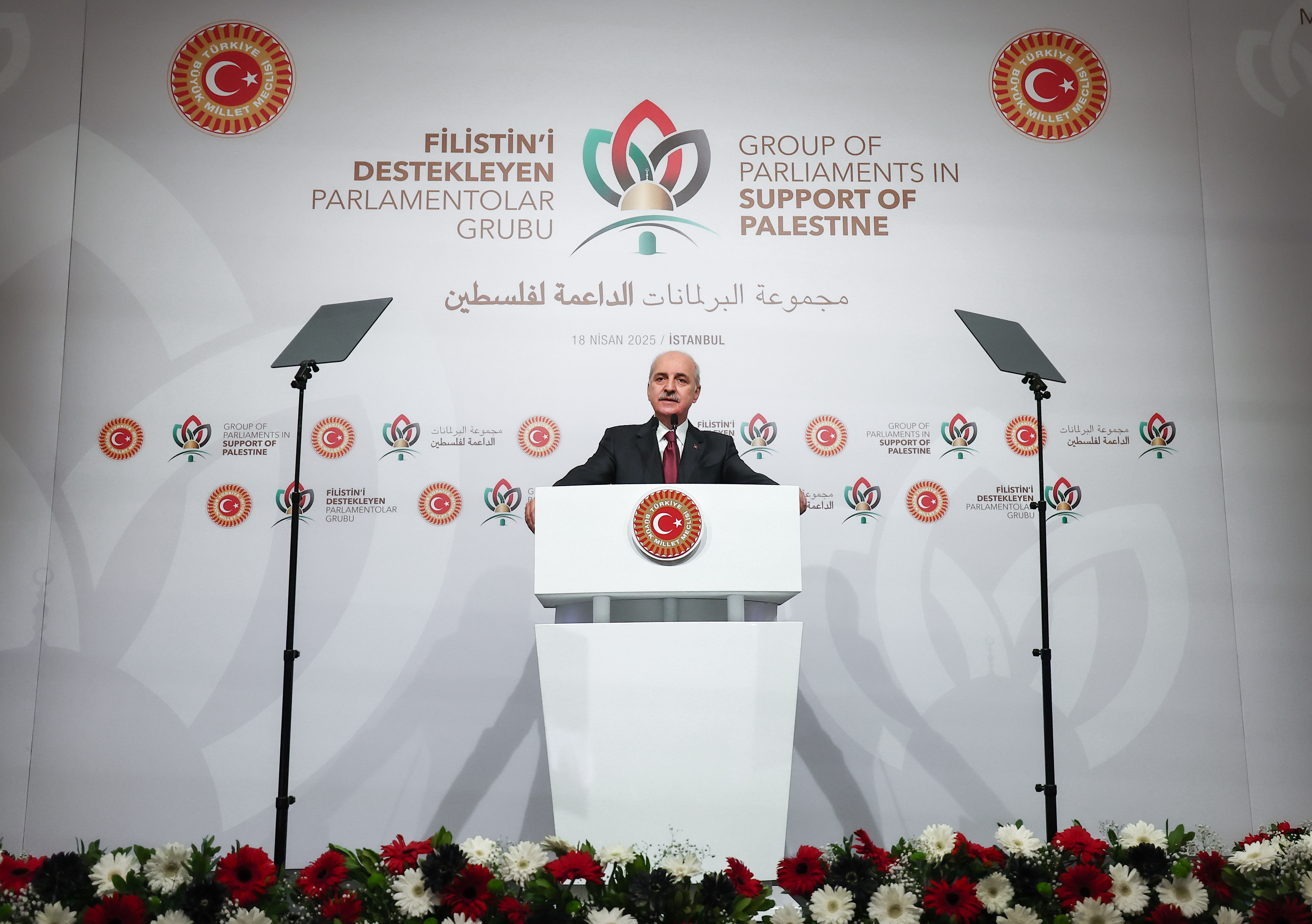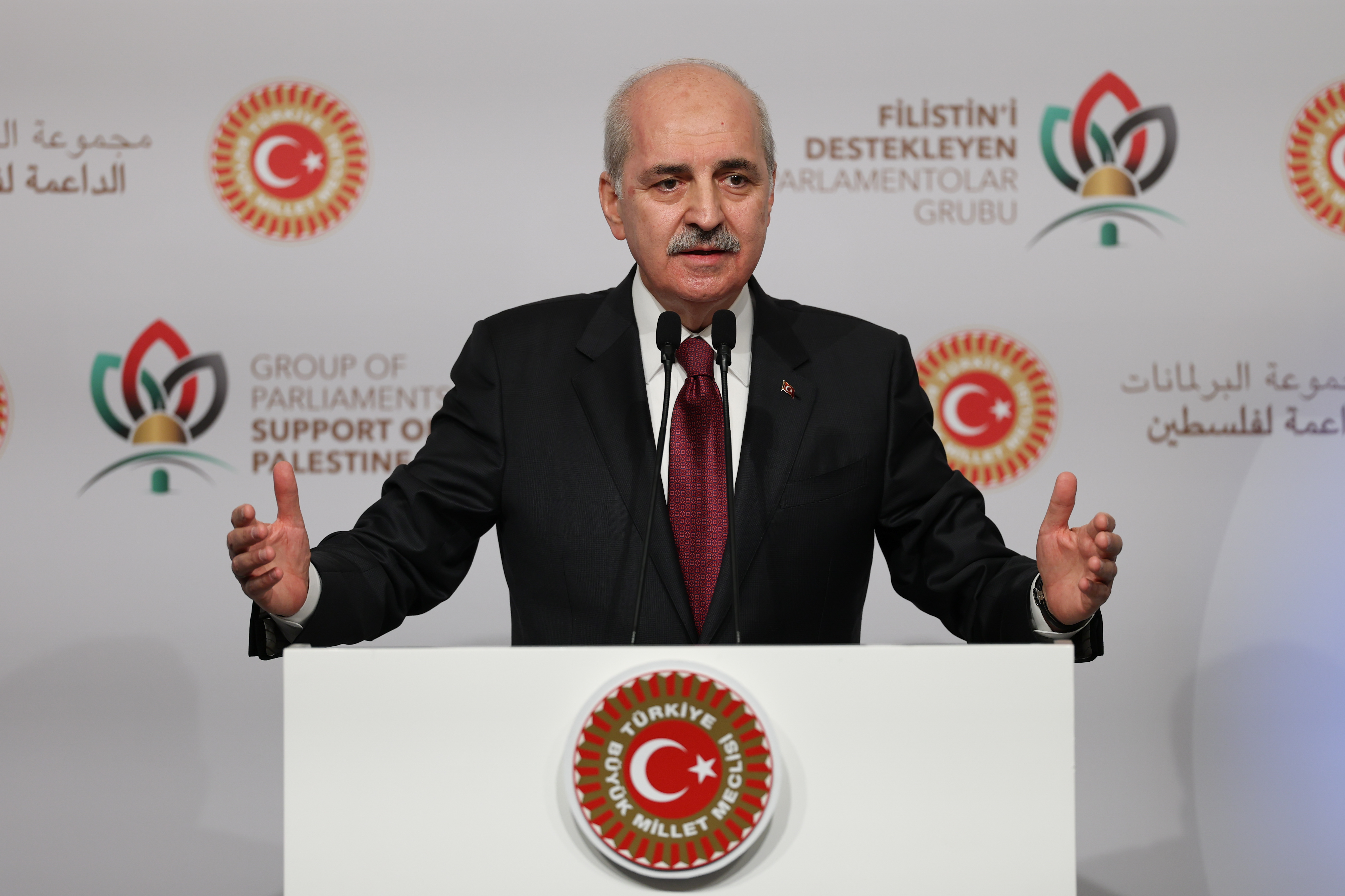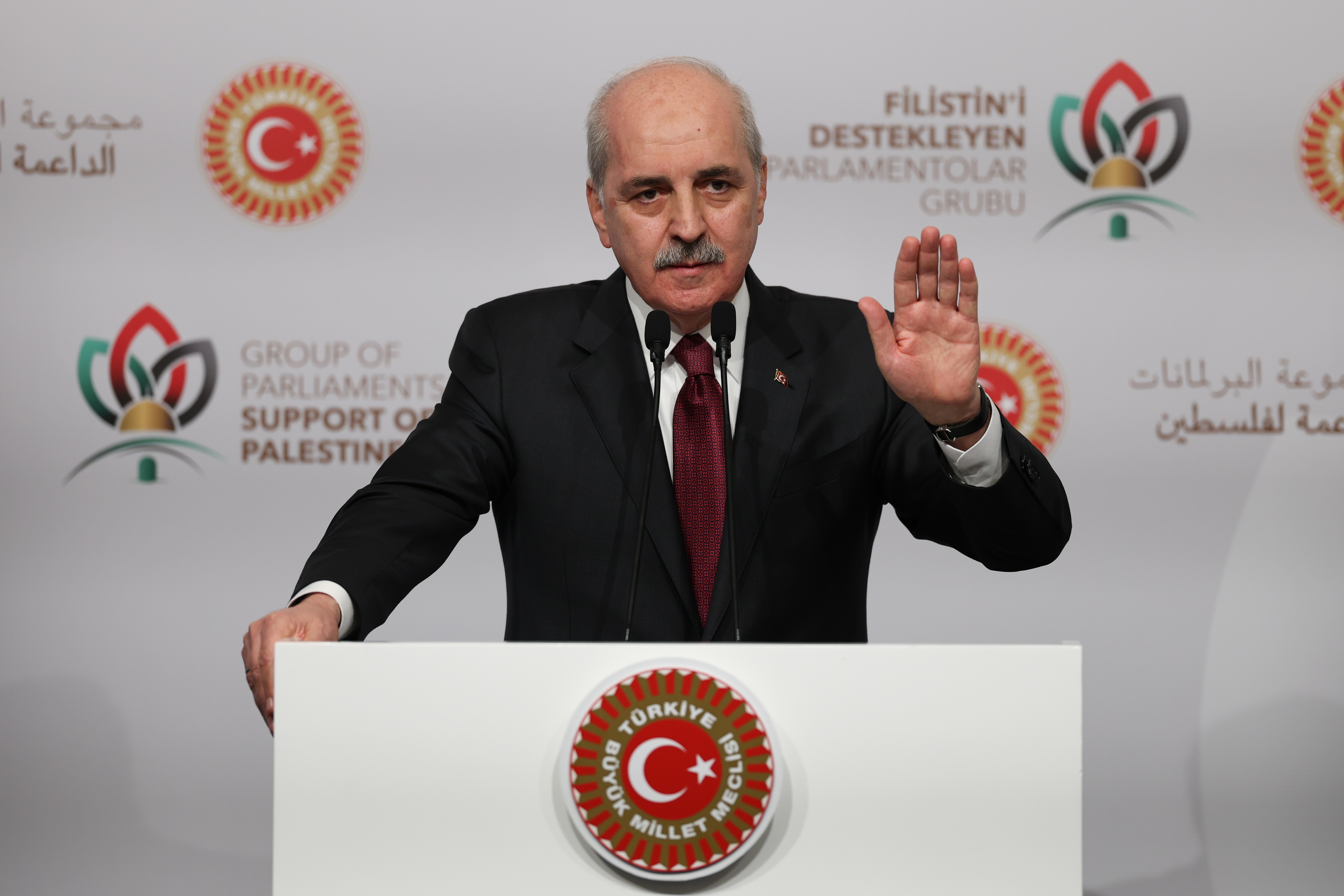 TBMM Başkanı Kurtulmuş, Cumhurbaşkanı Recep Tayyip Erdoğan’ın katılımıyla İstanbul’daki Conrad Otel’de gerçekleştirilen “Filistin’i Destekleyen Parlamentolar Grubu Toplantısı”nın açılışında konuştu.