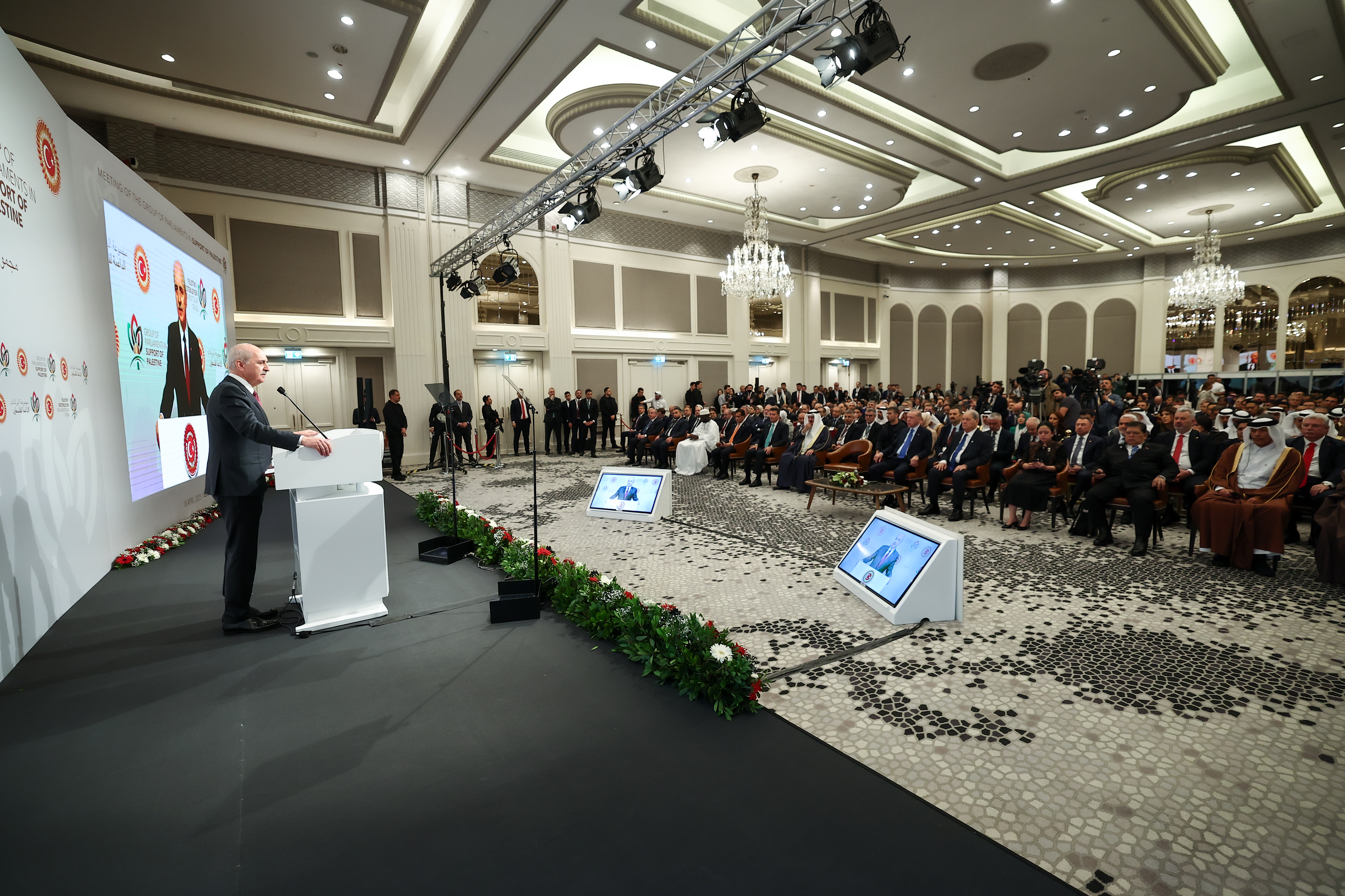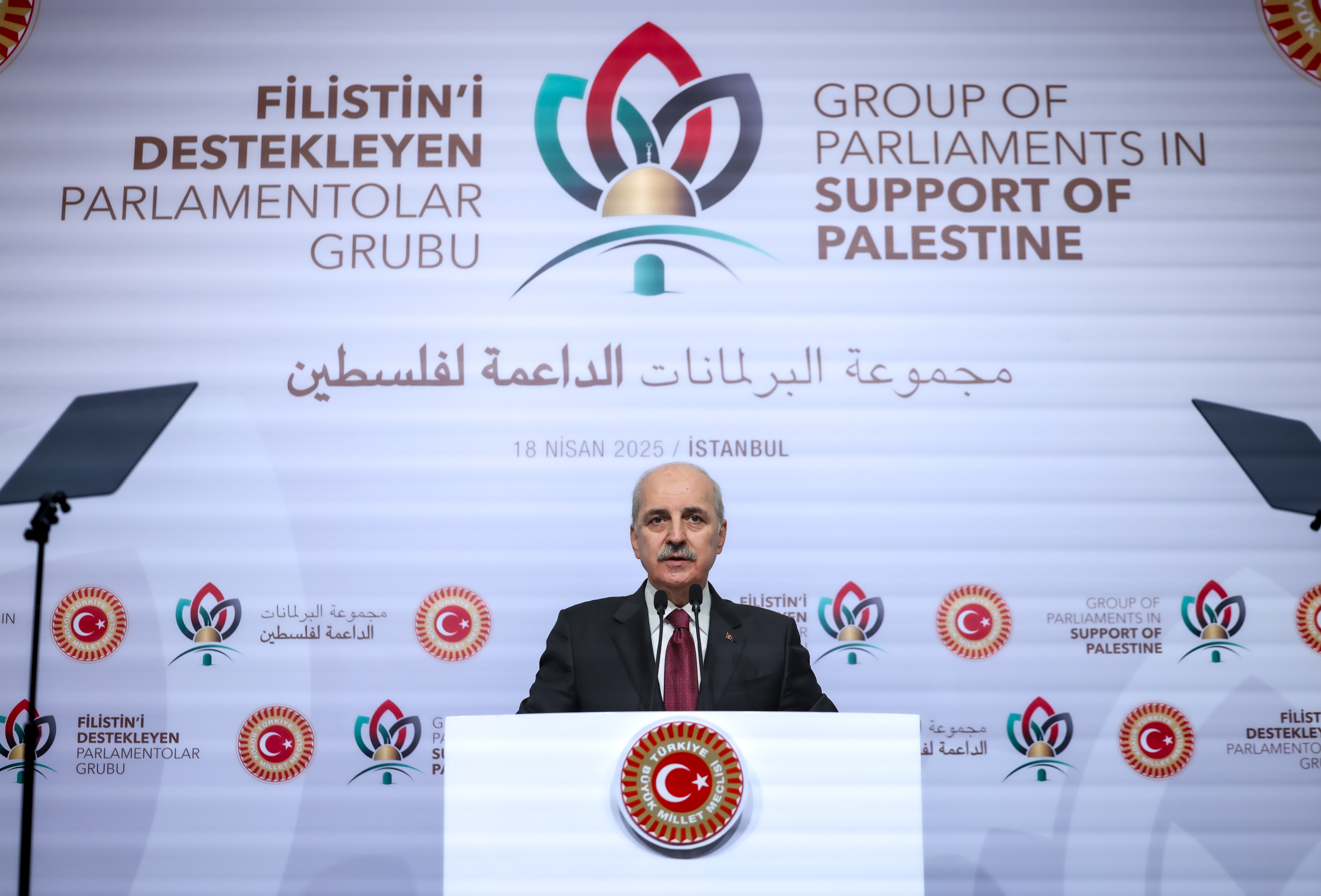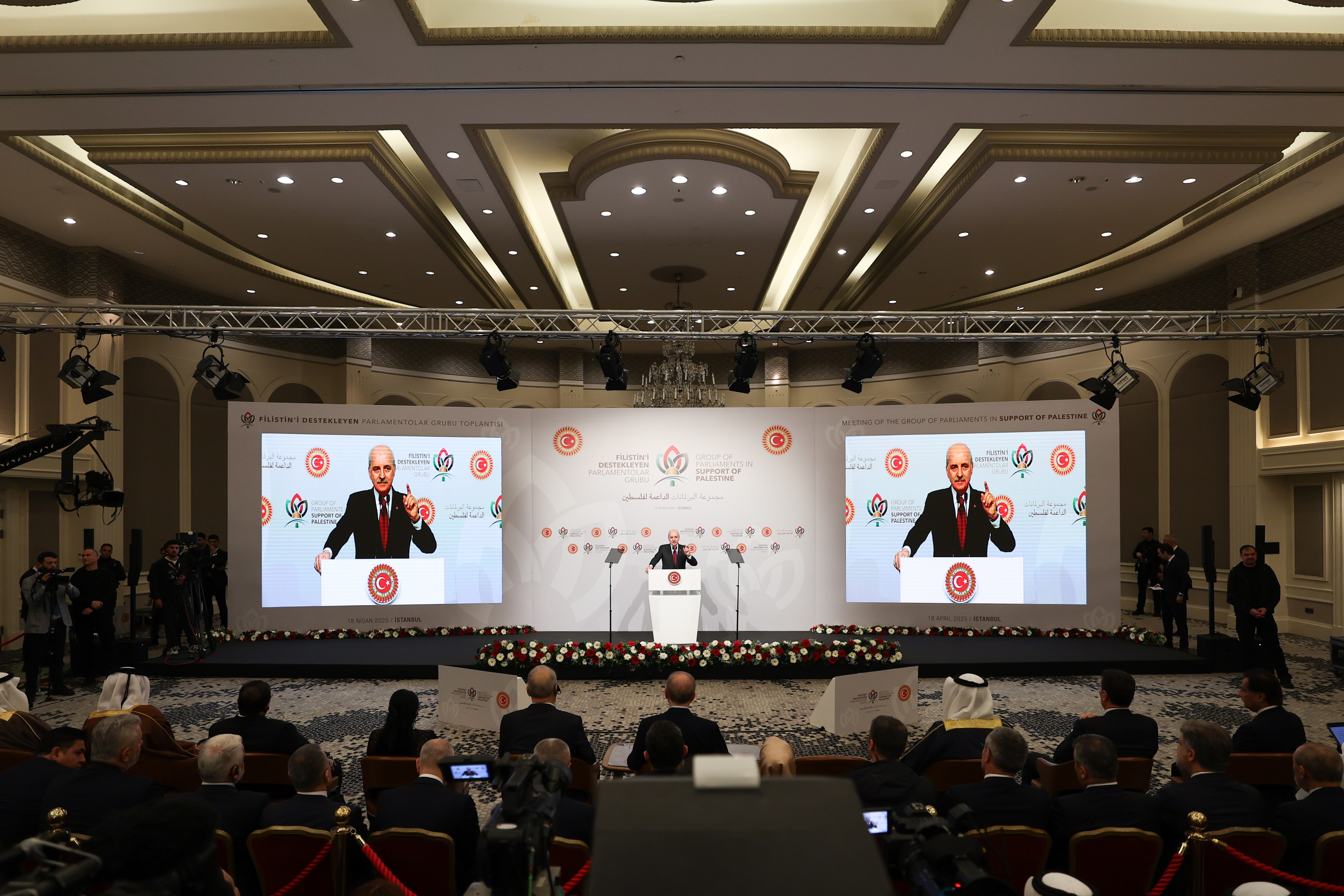 TBMM Başkanı Kurtulmuş, Cumhurbaşkanı Recep Tayyip Erdoğan’ın katılımıyla İstanbul’daki Conrad Otel’de gerçekleştirilen “Filistin’i Destekleyen Parlamentolar Grubu Toplantısı”nın açılışında konuştu.