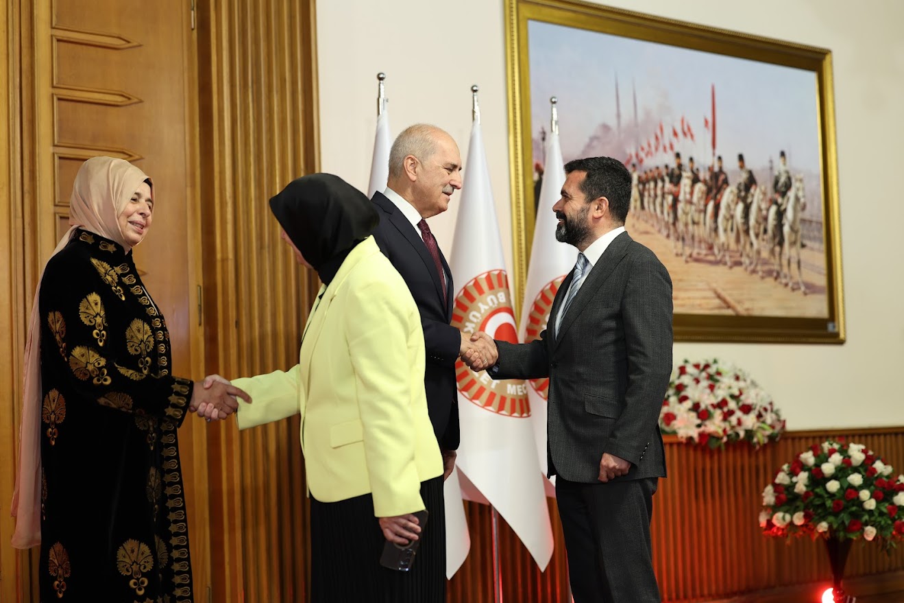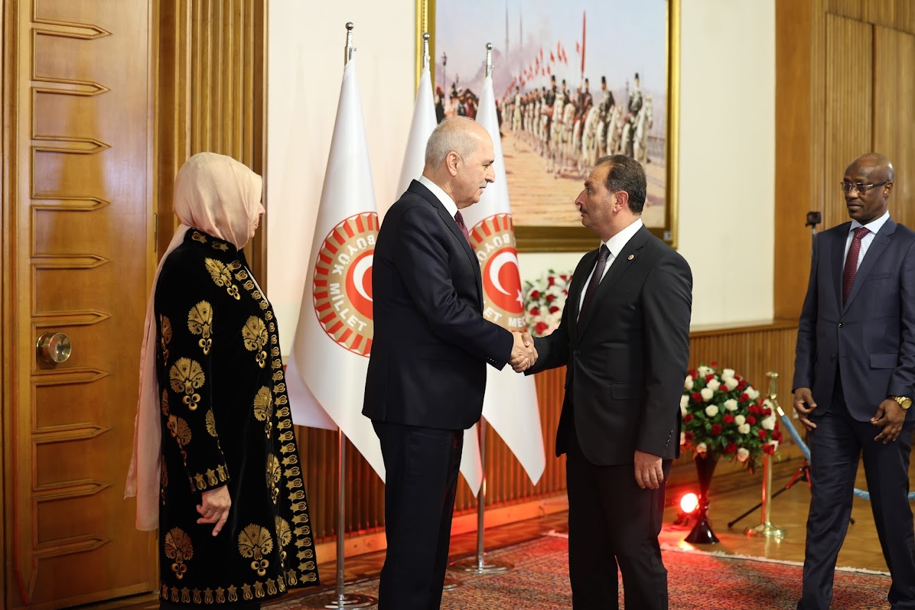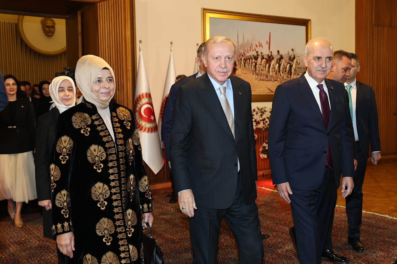 Cumhurbaşkanı Erdoğan, daha sonra TBMM Başkanı Kurtulmuş ile Tören Salonu'nun yanında bulunan Mermerli Salon'a geçti.