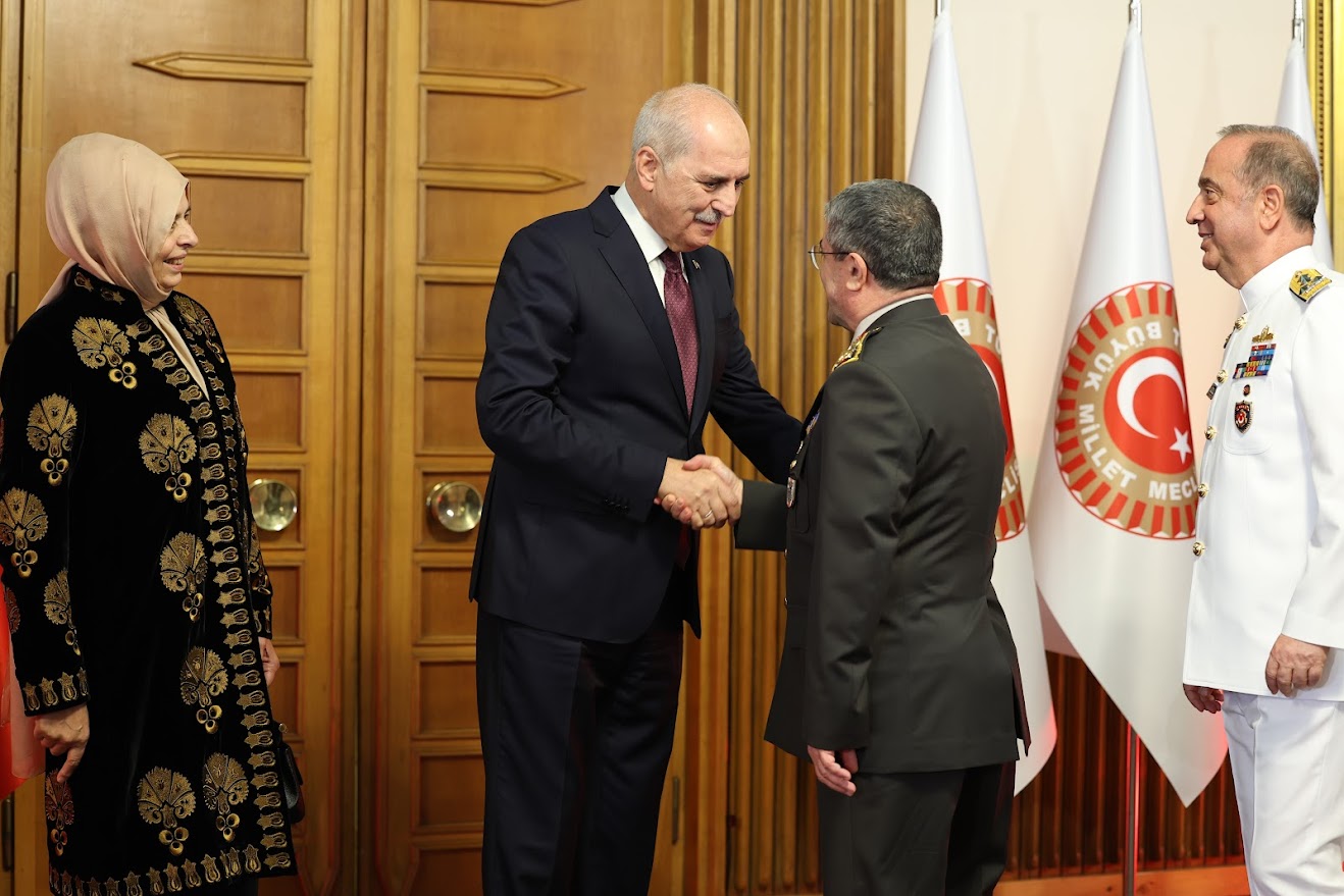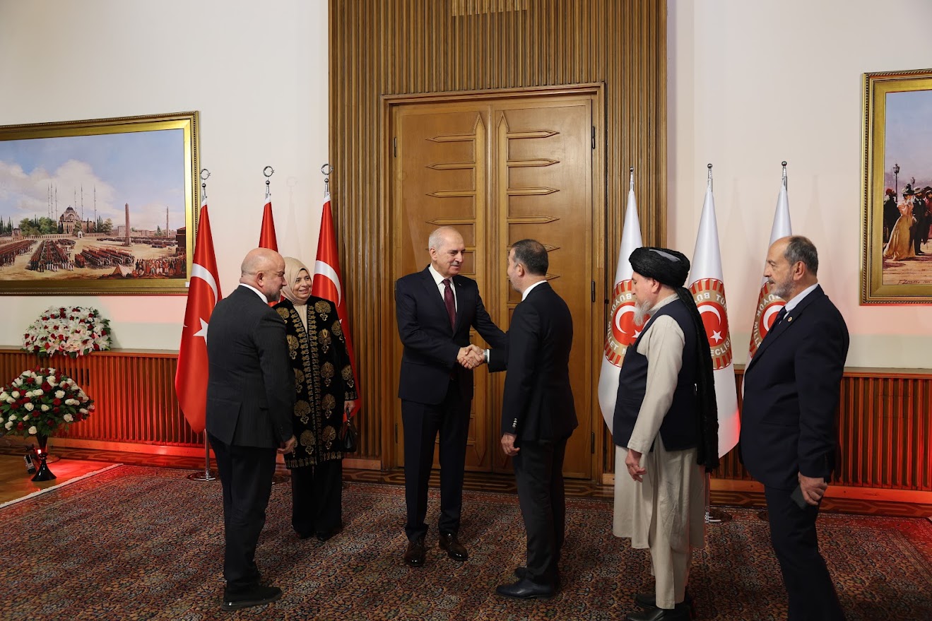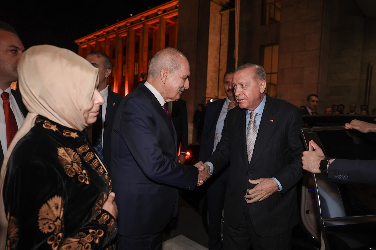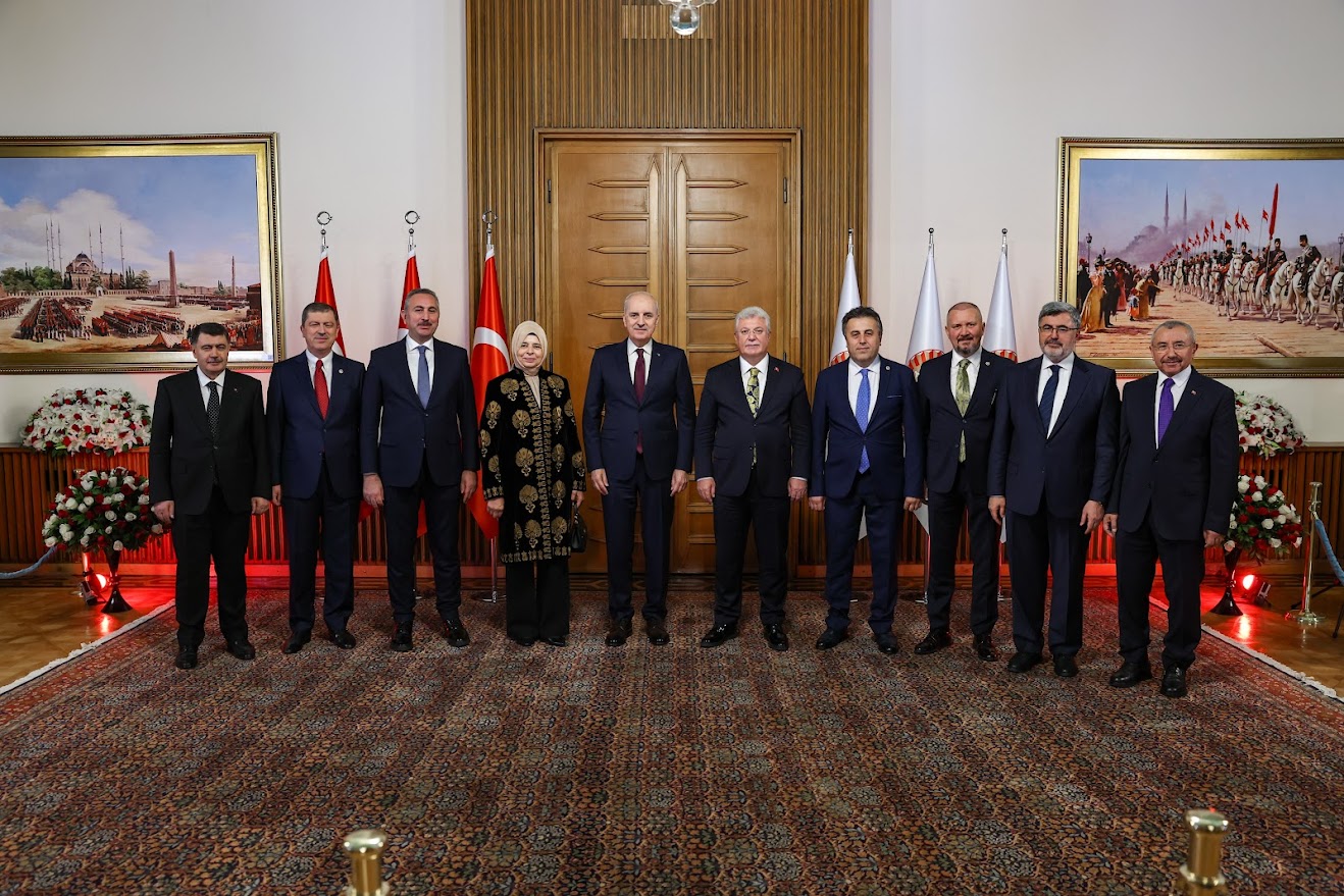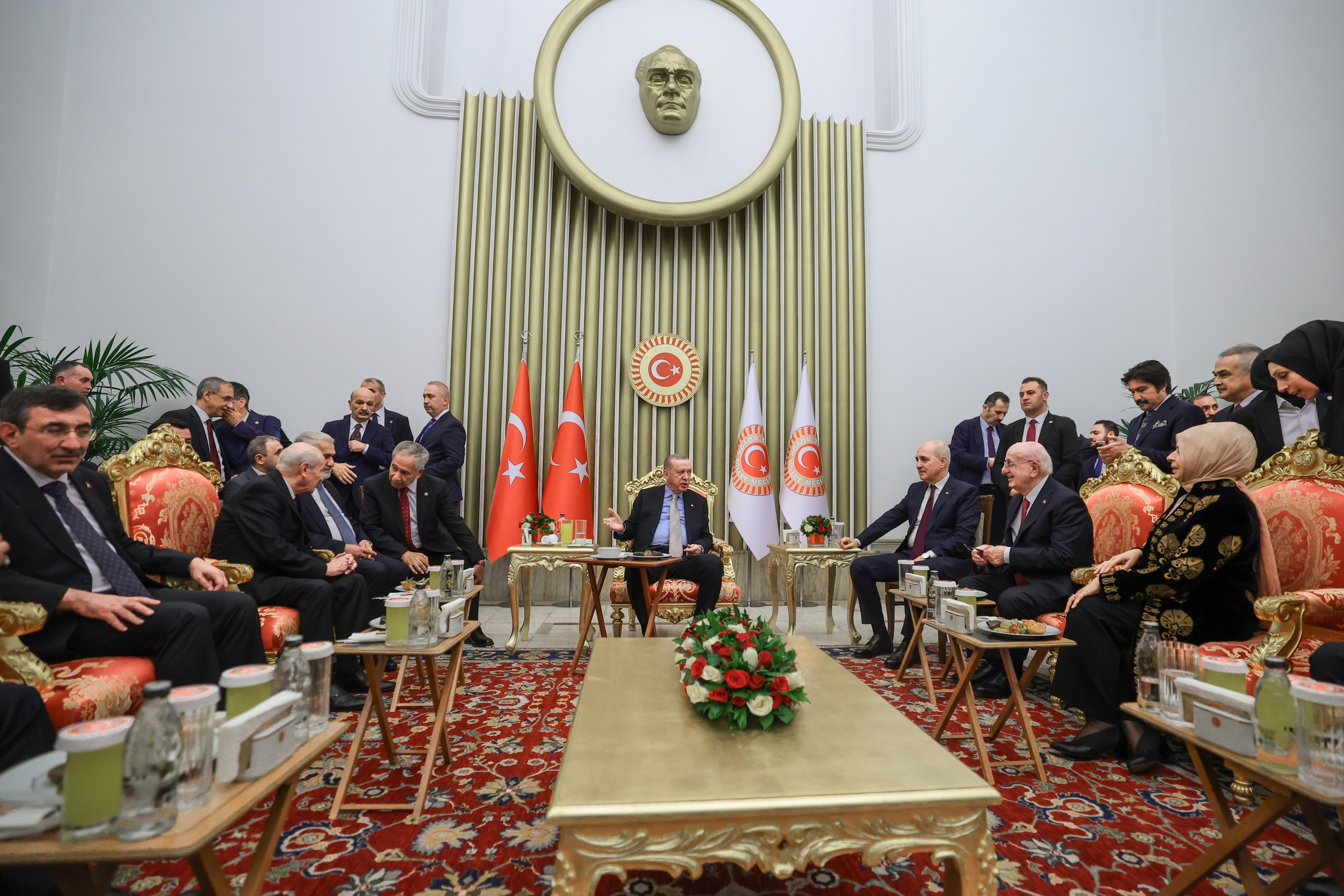 Cumhurbaşkanı Erdoğan, Mermerli Salon'da, TBMM Başkanı Kurtulmuş, Cumhurbaşkanı Yardımcısı Yılmaz, MHP Genel Başkanı Bahçeli, TBMM başkanvekilleri Pervin Buldan ve Celal Adan, AK Parti Grup Başkanı Abdullah Güler, DEM Parti Eş Genel başkanları Bakırhan ve Hatimoğulları, DEVA Partisi Genel Başkanı Babacan, Gelecek Partisi Genel Başkanı Davutoğlu, Saadet Partisi Genel Başkanı Arıkan, Yeniden Refah Partisi Genel Başkanı Erbakan, HÜDA PAR Genel Başkanı Yapıcıoğlu, BBP Genel Başkanı Destici, eski TBMM başkanları Bülent Arınç ve İsmail Kahraman ve bazı milletvekilleriyle bir araya geldi.