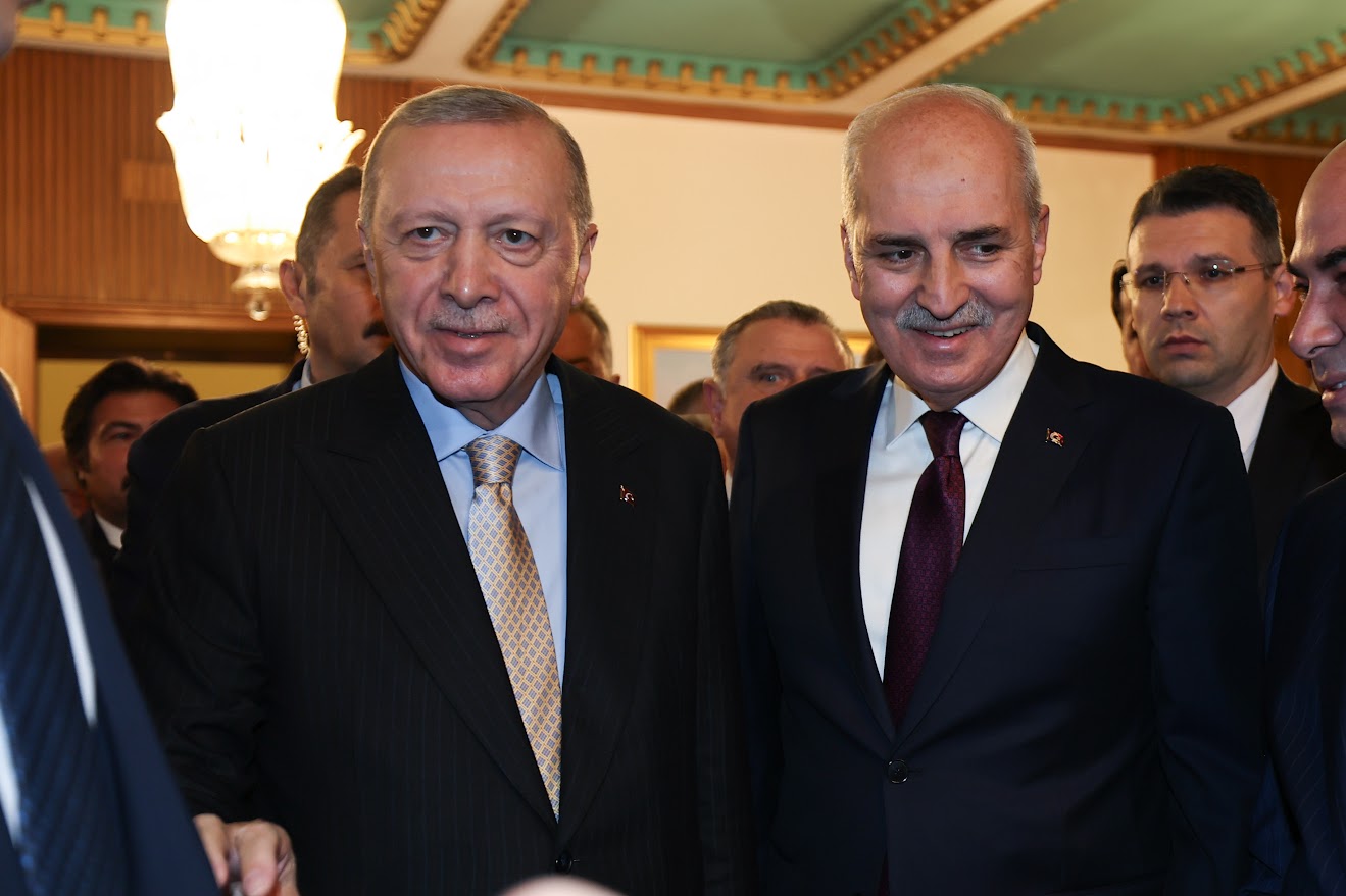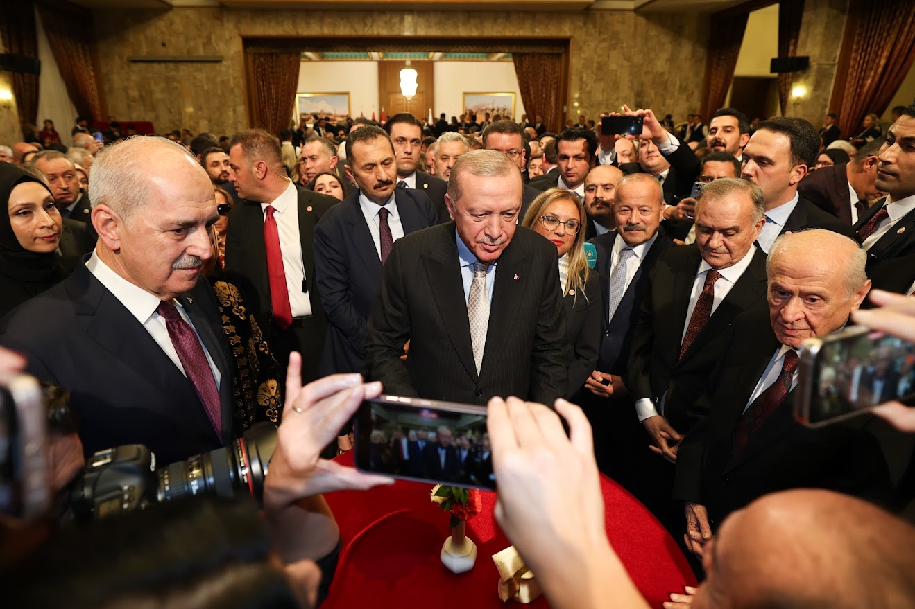 Cumhurbaşkanı Erdoğan, MHP Genel Başkanı Bahçeli'nin ve MHP'li milletvekillerinin bulunduğu, DEM Parti Eş Genel başkanları Bakırhan ve Hatimoğulları ile DEM Parti'li milletvekillerinin olduğu masaları ayrı ayrı ziyaret etti.