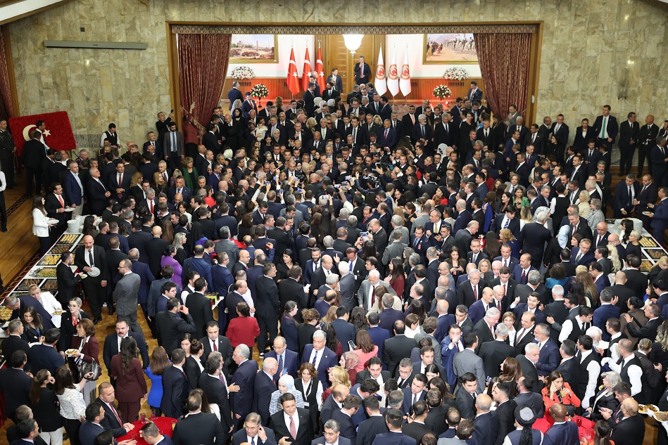 TBMM Tören Salonu'ndaki resepsiyona, Cumhurbaşkanı Recep Tayyip Erdoğan, Cumhurbaşkanı Yardımcısı Cevdet Yılmaz, Adalet Bakanı Yılmaz Tunç, İçişleri Bakanı Ali Yerlikaya, Sağlık Bakanı Kemal Memişoğlu, Gençlik ve Spor Bakanı Osman Aşkın Bak, AK Parti Grup Başkanı Abdullah Güler, MHP Genel Başkanı Devlet Bahçeli, DEM Parti Eş Genel başkanları Tuncer Bakırhan ve Tülay Hatimoğulları, Gelecek Partisi Genel Başkanı Ahmet Davutoğlu, DEVA Partisi Genel Başkanı Ali Babacan, Saadet Partisi Genel Başkanı Mahmut Arıkan, Yeniden Refah Partisi Genel Başkanı Fatih Erbakan, HÜDA PAR Genel Başkanı Zekeriya Yapıcıoğlu, BBP Genel Başkanı Mustafa Destici, Cumhurbaşkanlığı İletişim Başkanı Burhanettin Duran, partilerin grup başkanvekilleri, milletvekilleri, bürokratlar, yabancı misyon temsilcileri, sivil toplum kuruluşu temsilcileri, sanatçılar ile çok sayıda davetli katıldı.