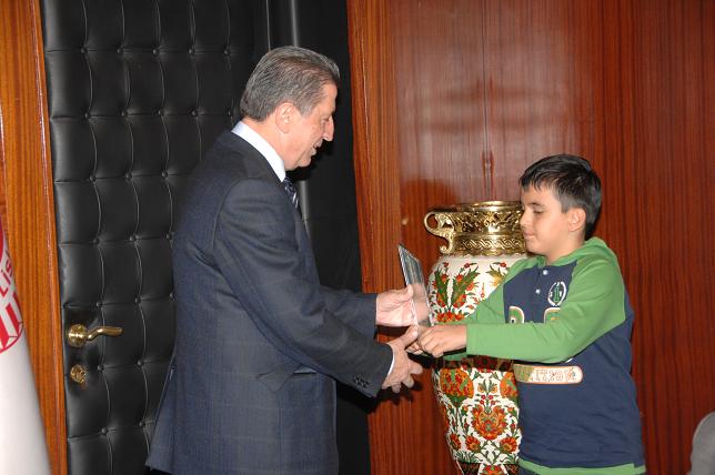 Konuşmaların ardından Öztürk, Toptan'a bir plaket sunarken, Toptan da şehit çocuğu Buğrahan Demirdüyen'e dizüstü bilgisayar hediye etti.