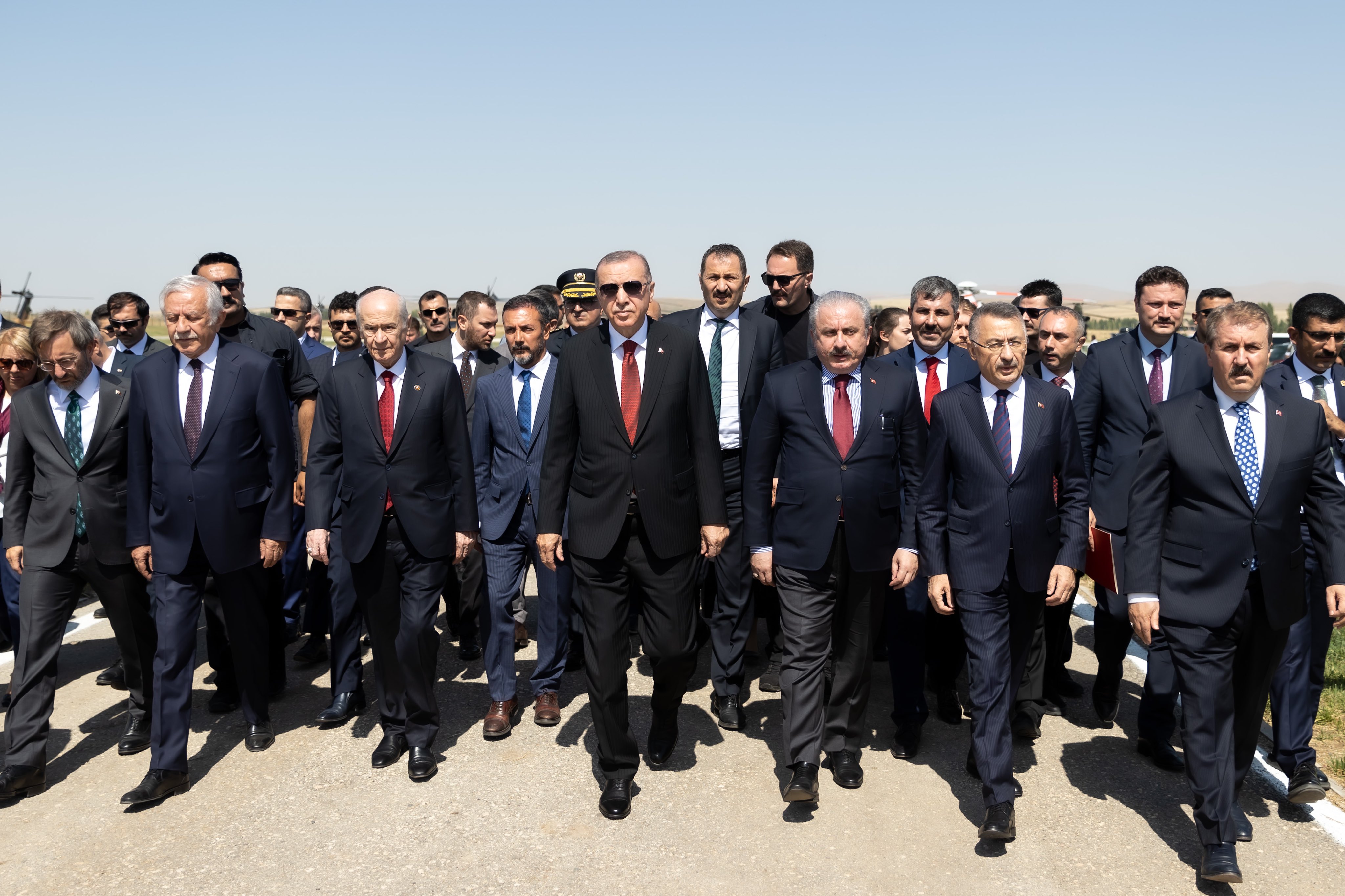 Diyanet İşleri Başkanı Ali Erbaş'ın kıldırdığı cuma namazında Cumhurbaşkanı Erdoğan ve TBMM Başkanı Şentop'a, Cumhurbaşkanı Yardımcısı Fuat Oktay, Adalet Bakanı Bekir Bozdağ, Dışişleri Bakanı Mevlüt Çavuşoğlu, İçişleri Bakanı Süleyman Soylu, Hazine ve Maliye Bakanı Nureddin Nebati, Kültür ve Turizm Bakanı Mehmet Nuri Ersoy, Milli Savunma Bakanı Hulusi Akar, Milli Eğitim Bakanı Mahmut Özer, Sağlık Bakanı Fahrettin Koca, Sanayi ve Teknoloji Bakanı Mustafa Varank, Ulaştırma ve Altyapı Bakanı Adil Karaismailoğlu, Tarım ve Orman Bakanı Vahit Kirişci, Ticaret Bakanı Mehmet Muş, Genelkurmay Başkanı Orgeneral Yaşar Güler ve kuvvet komutanları ile AK Parti Genel Başkanvekili Binali Yıldırım da eşlik etti.
