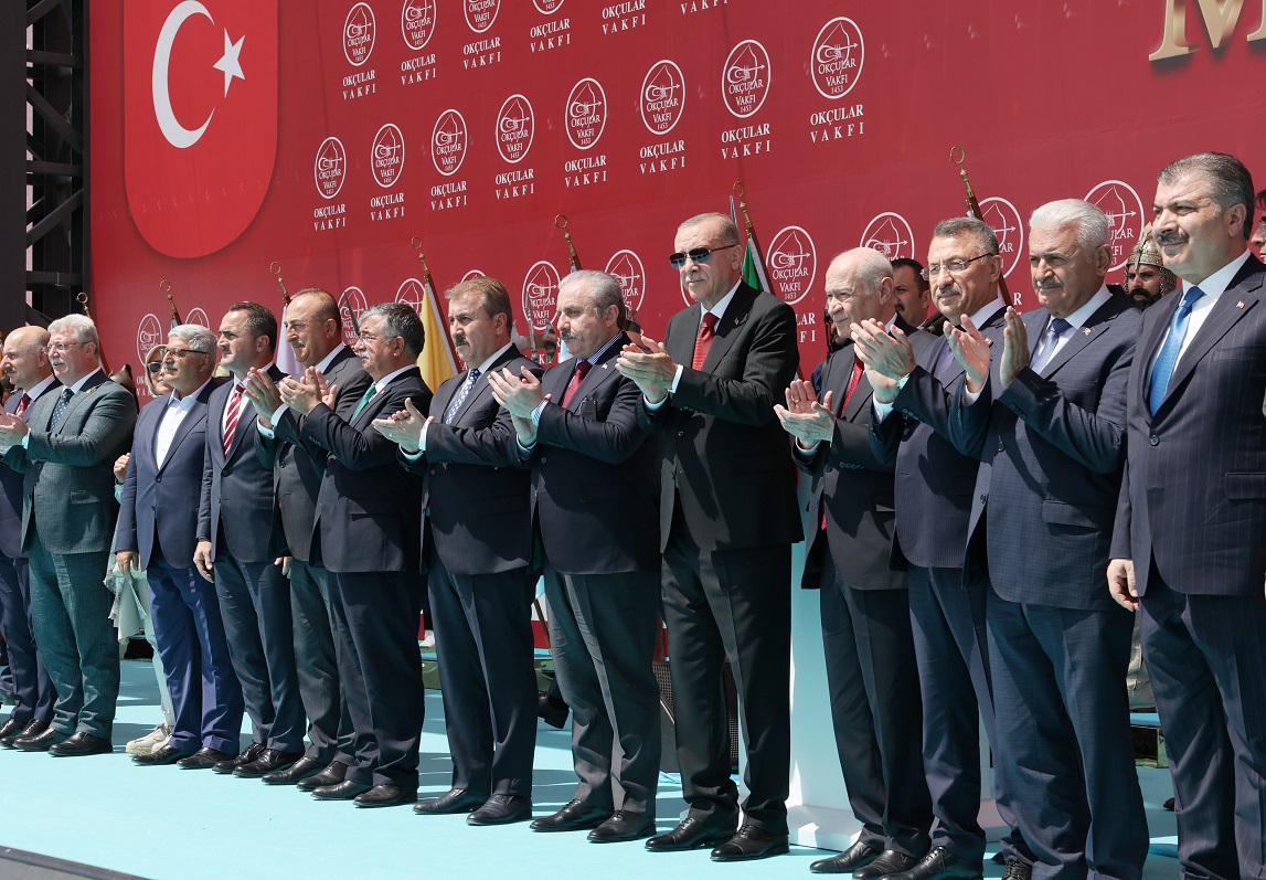"Arif Nihat ne güzel söylüyor, 'Ezanımdan alışıp tekbire, buldunuz mutluluk imanımla, vatan ettim sizi ey topraklar, 5 vakit damgalayıp alnımla.' Millet olarak bugün de istiklalimizin işaretleri olarak semalarımızda yankılanan ezanları ve nazlı nazlı dalgalanan al bayrağı özellikle görmemizin gerisinde işte böyle bir şevk ve aşk vardır. Biz ezanlar susmayacak, bayrak inmeyecek dedikçe yürekleri daralanlar, gözleri dönenler, elleri ayakları titreyenler beyhude yere endişe ediyor. Bu ezanlar, bu bayraklar, bu zaferler, bu şehitler onların da özgürlüğünün, haysiyetinin, geleceğinin teminatıdır. Yeter ki vatanlarına ihanet etmesinler, yeter ki milletine düşmanlık yapmasınlar, yeter ki milli ve manevi değerlerimize husumet beslemesinler. Bunun dışında herkes başımızın tacıdır. Ülkemizin hamdolsun herkese yetecek imkanı vardır."