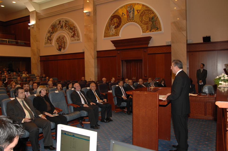 Makedonya Cumhuriyeti'ne gerçekleştirdiği resmi ziyaret çerçevesinde Makedonya Meclisi Genel Kurulu'na hitap eden TBMM Başkanı Köksal Toptan, Türk halkının Makedonya'ya duyduğu sevgiyi dile getirerek sözlerine başladı.