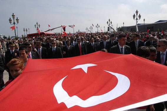 top atışları ve sirenler eşliğinde göndere çekilmek üzere kutlama törenlerinin