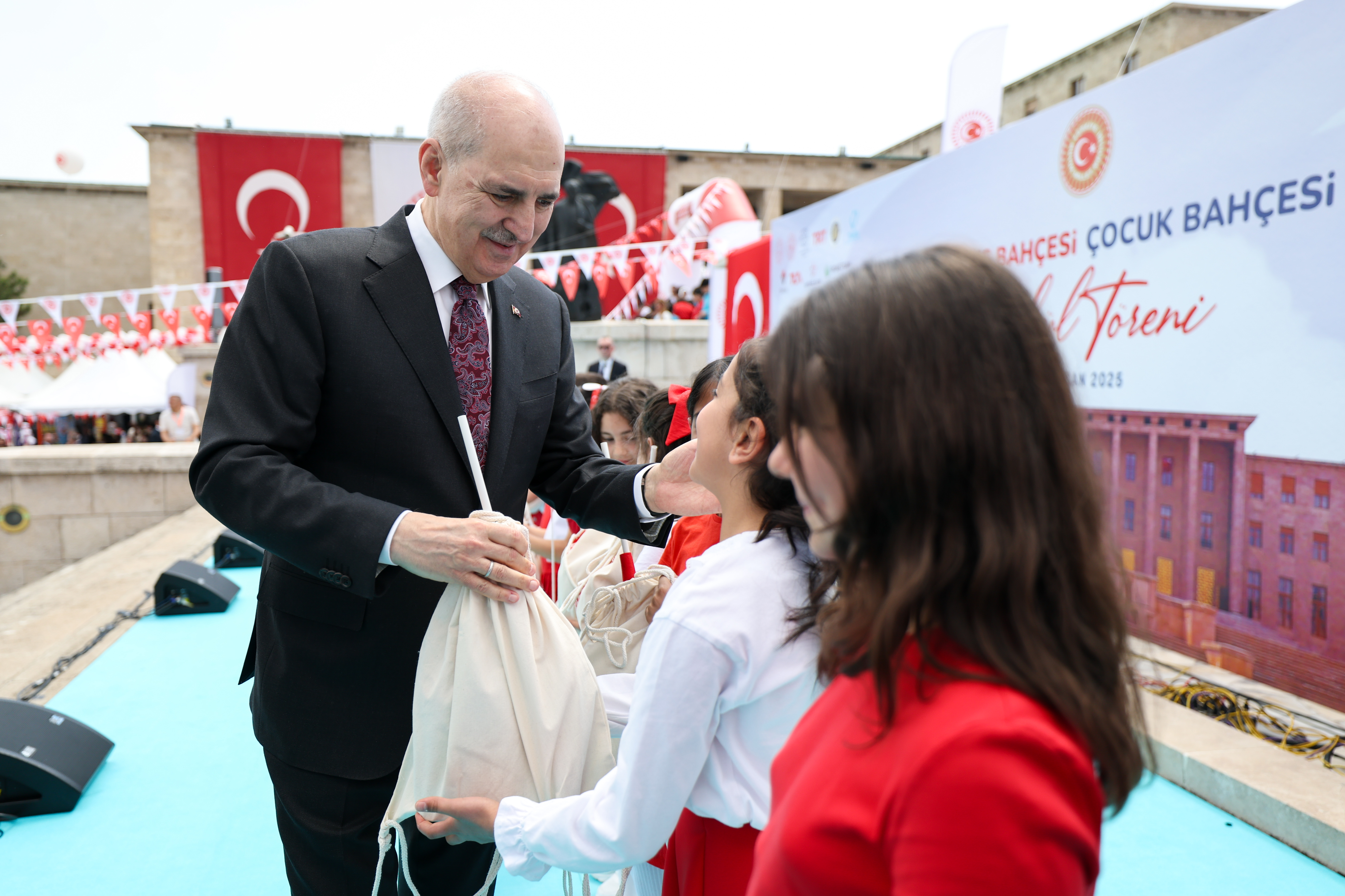 “Millet Bahçesi Çocuk Bahçesi kavramıyla da aslında bu bayramın ikinci ayağını hatırlatmak istiyoruz. Cumhuriyet, sadece değerlerimize sahip çıkmak, sadece milli egemenliği hatırlamak, sadece bugünü değerlendirmek ve bugüne ait işler yapmakla da ileriye gidecek değildir. Dolayısıyla Cumhuriyeti daha ileriye taşımak için Cumhuriyeti sonraki nesillere aktaracak olan evlatlarımızı güçlü kılmak, onlarla birlikte Çocuk Bayramı olarak ilan ettiğimiz bu bayramı genç nesillerin, çocuklarımızın, evlatlarımızın sırtında ileriye taşımak da hepimizin sorumluluğudur.