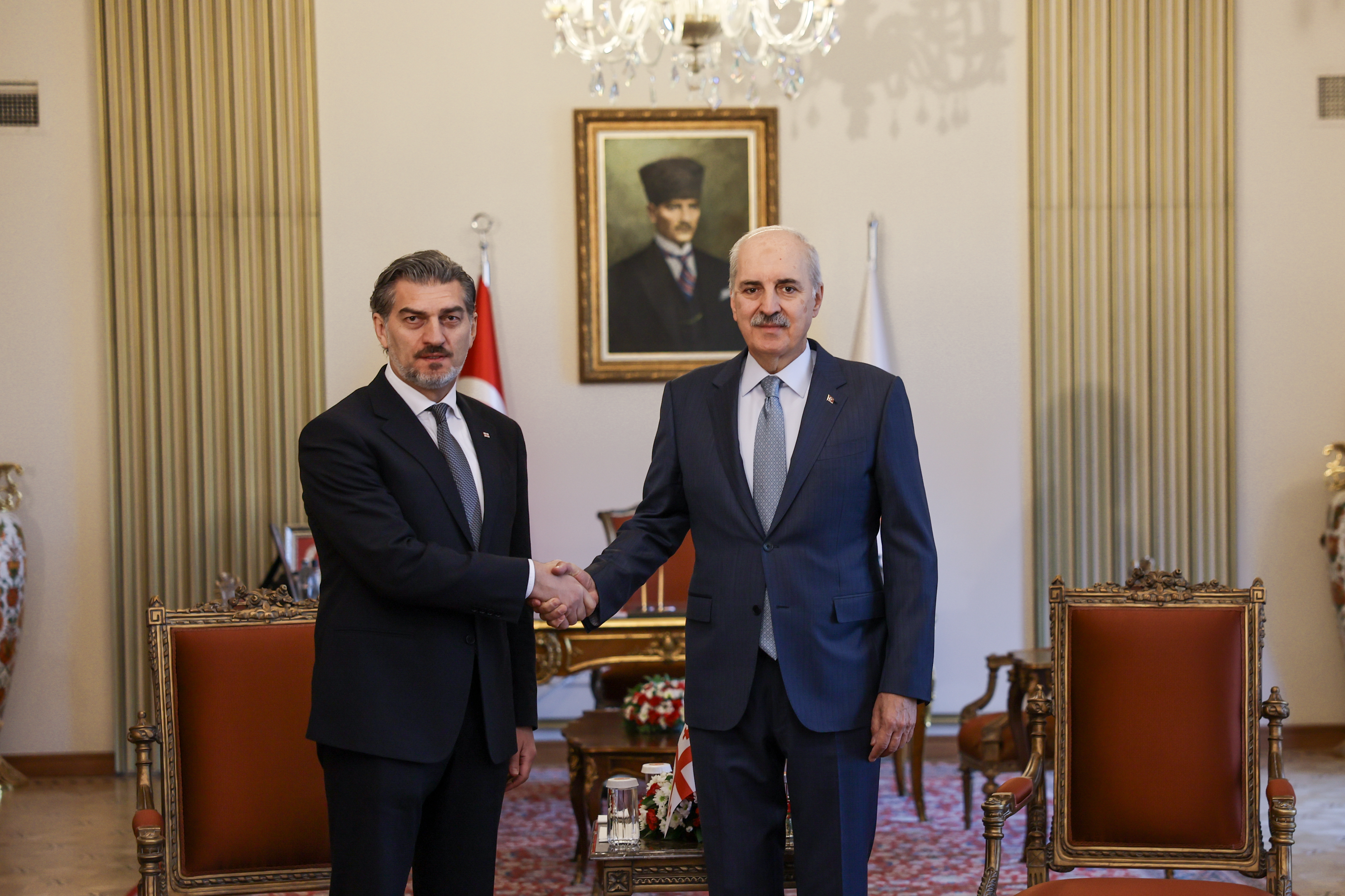 TBMM Başkanı Kurtulmuş, Gürcistan Cumhurbaşkanı Kavelaşvili’yi Meclis’e gelişinde karşılamasının ardından Türkiye ve Gürcistan bayrakları önünde el sıkışarak fotoğraf verdi.