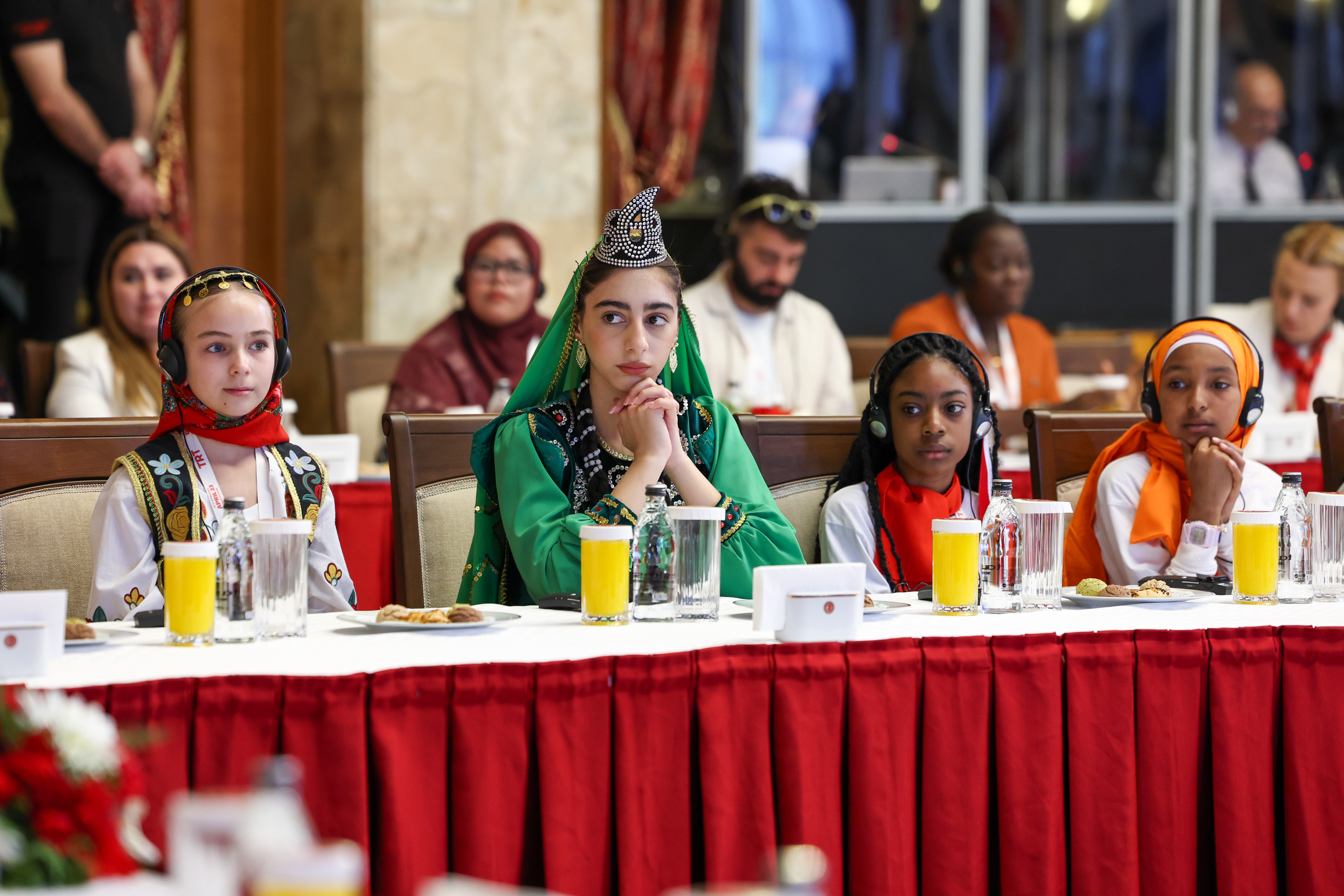 "En başta Filistin'de, Gazze'de, şu anda biz burada konuşurken tepelerine bomba yağdırılan ufacık evlatlarımızı, çocuklarımızı, kendi çocuklarımız olarak görüyor ve onların hayattan koparılmasını da bütün insanlığın ortak bir suçu olduğunu burada bir kere daha ifade ediyoruz. Dünyanın bir çok yerinde savaşlar, zulümler ve baskıların olmasının yanı sıra hayattan koparılmış, akranları okullara giderken ellerine tutuşturulan silahlarla savaşın unsurları haline getirilmiş çok sayıda çocuk savaşçının olduğunu da üzülerek ifade etmek isterim. Oyun alanlarında ve okulların o cıvıl cıvıl neşeyle sürdürülen eğitim ortamlarında olmaları gerekirken birtakım karanlık güçler tarafından savaşa itilen, savaş ortamına sokulan gencecik çocukların, ufacık evlatlarımızın ellerinde silahlarla dolaştırılmasının insanlığın büyük bir ayıbı olduğunun altını çizmek isterim."