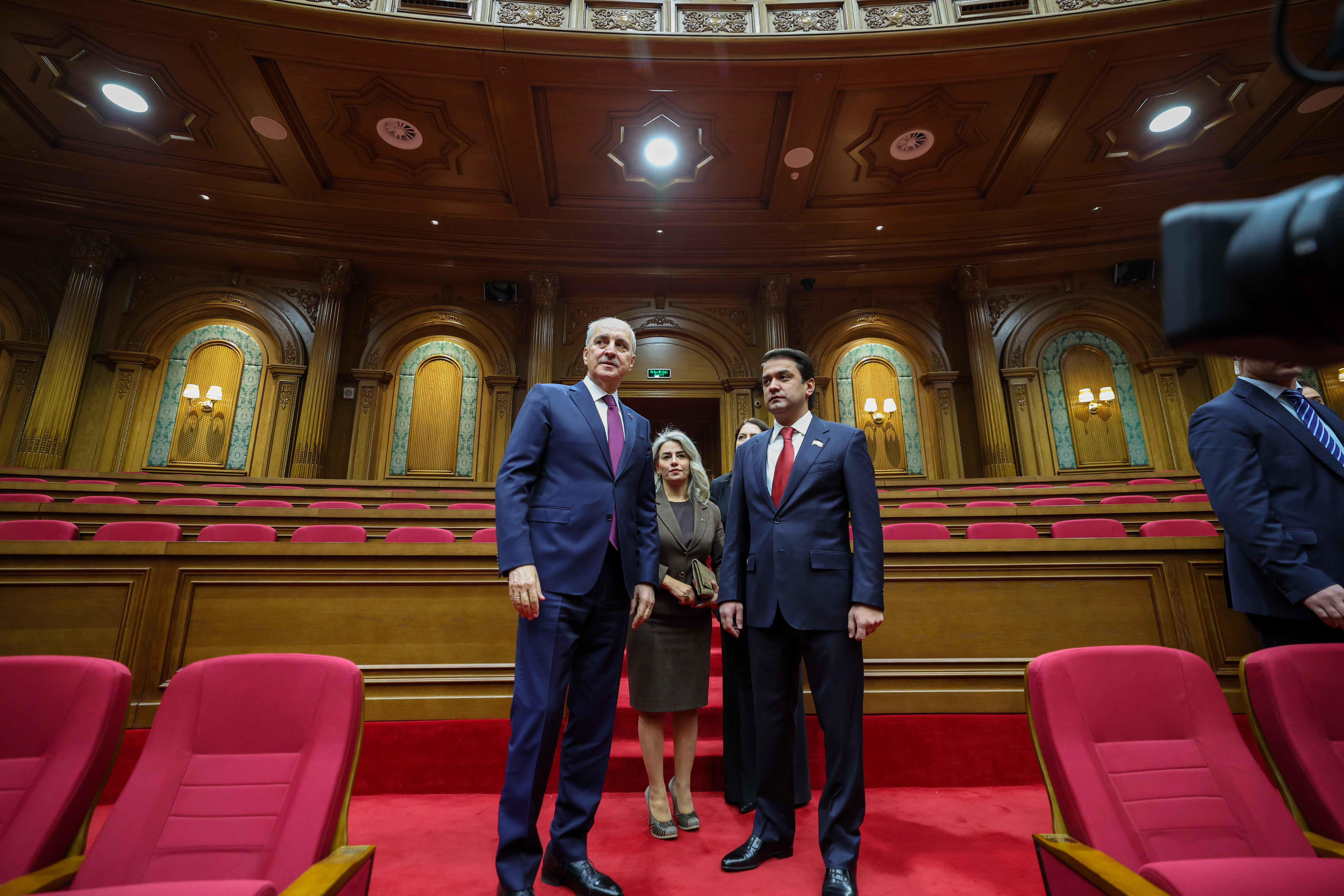 Emomali, TBMM Başkanı Kurtulmuş’u Ali Meclis’e gelişinde Türkiye ve Tacikistan bayraklarının önünde karşıladıktan sonra Genel Kurul salonunu gezdirdi, Meclisin çalışmaları hakkında bilgi verdi.